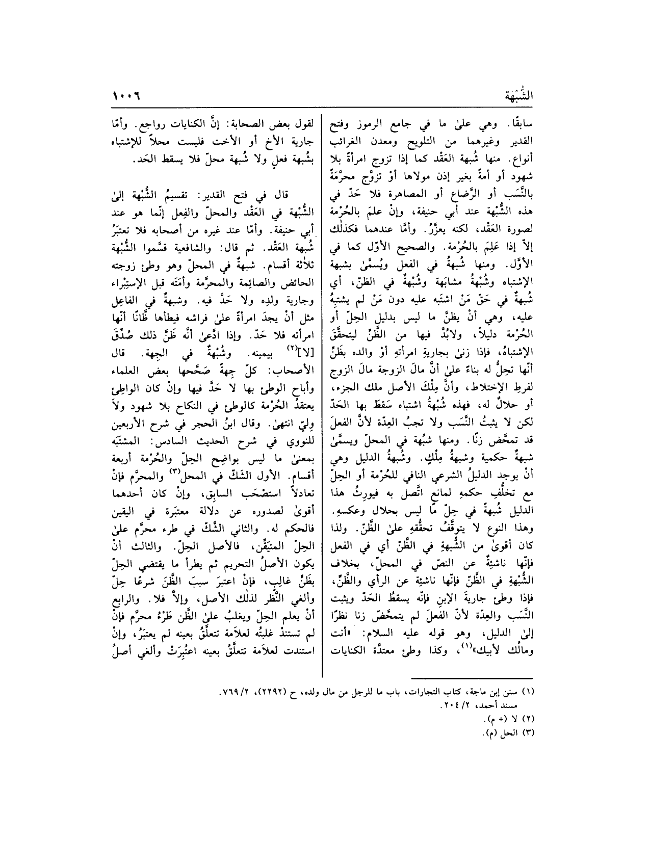 قال في فتح القدير: تقسيم الشّبهة إلى الشّبهة في العقد والمحلّ والفعل إنّما هو عند أبي حنيفة. وأمّا عند غيره من أصحابه فلا تعتبر شبهة العقد. ثم قال: والشافعية قسّموا الشّبهة ثلاثة أقسام. شبهة في المحلّ وهو وطئ زوجته الحائض والصائمة والمحرّمة وأمته قبل الاستبراء وجارية ولده ولا حدّ فيه. وشبهة في الفاعل مثل أن يجد امرأة على فراشه فيطأها ظانّا أنّها امرأته فلا حدّ. وإذا ادّعى أنّه ظنّ ذلك صدّق [لا] «2» بيمينه. وشبهة في الجهة. قال الأصحاب: كلّ جهة صحّحها بعض العلماء وأباح الوطء بها لا حدّ فيها وإن كان الواطئ يعتقد الحرمة كالوطء في النكاح بلا شهود ولا وليّ انتهى. وقال ابن الحجر في شرح الأربعين للنووي في شرح الحديث السادس: المشتبه بمعنى ما ليس بواضح الحلّ والحرمة أربعة أقسام. الأول الشكّ في المحل «3» والمحرّم فإن تعادلا استصحب السابق، وإن كان أحدهما أقوى لصدوره عن دلالة معتبرة في اليقين فالحكم له. والثاني الشّكّ في طرء محرّم على الحلّ المتيقّن، فالأصل الحلّ. والثالث أن يكون الأصل التحريم ثم يطرأ ما يقتضي الحلّ بظنّ غالب، فإن اعتبر سبب الظّن شرعا حلّ وألغي النّظر لذلك الأصل، وإلّا فلا. والرابع أن يعلم الحلّ ويغلب على الظّن طرء محرّم فإن لم تستند غلبته لعلامة تتعلّق بعينه لم يعتبر، وإن استندت لعلامة تتعلّق بعينه اعتبرت وألغي أصل