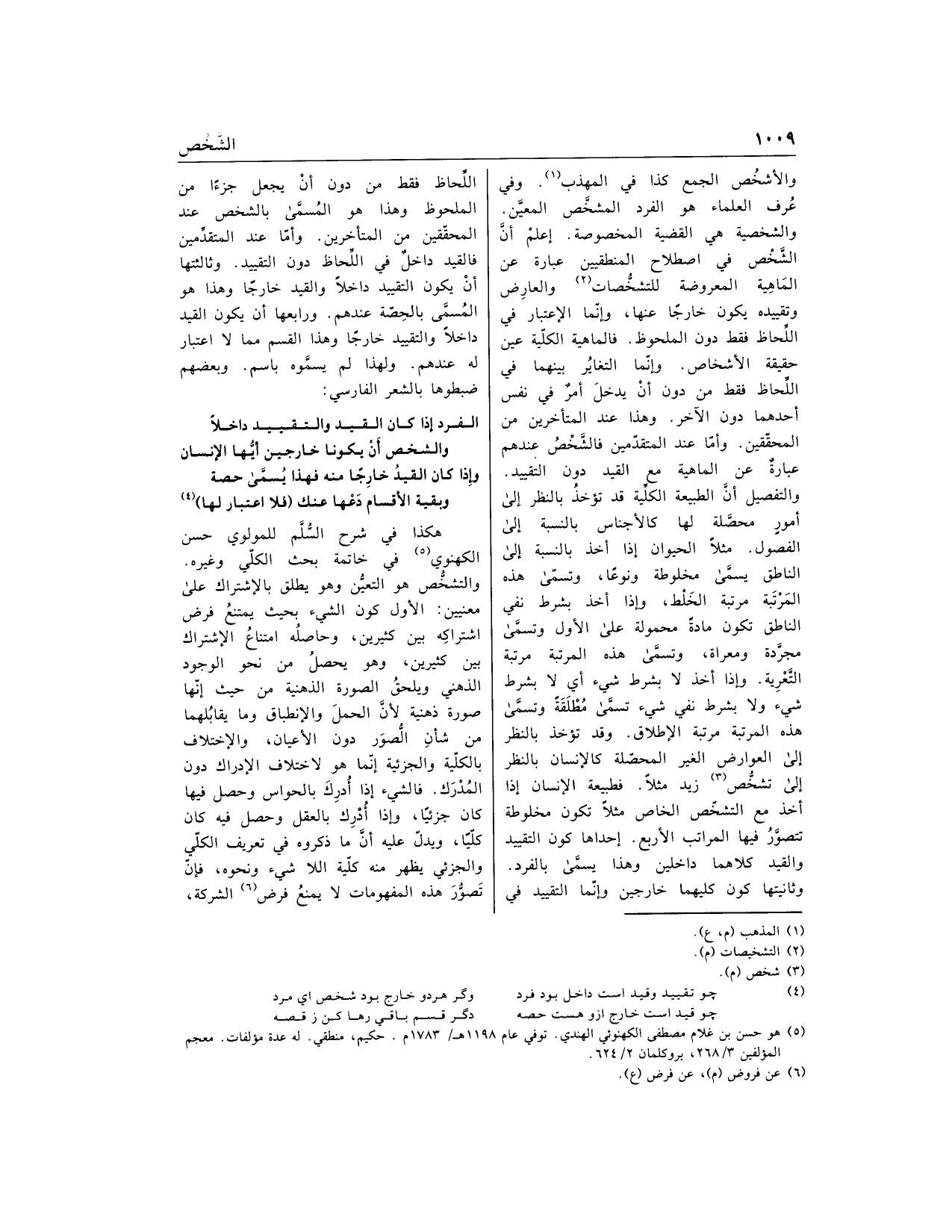 الفرد إذا كان القيد والتقييد داخلا والشخص أن يكونا خارجين أيّها الإنسان وإذا كان القيد خارجا منه فهذا يسمّى حصة وبقية الأقسام دعها عنك (فلا اعتبار لها) «4» هكذا في شرح السّلّم للمولوي حسن اللكهنوي «5» في خاتمة بحث الكلّي وغيره.