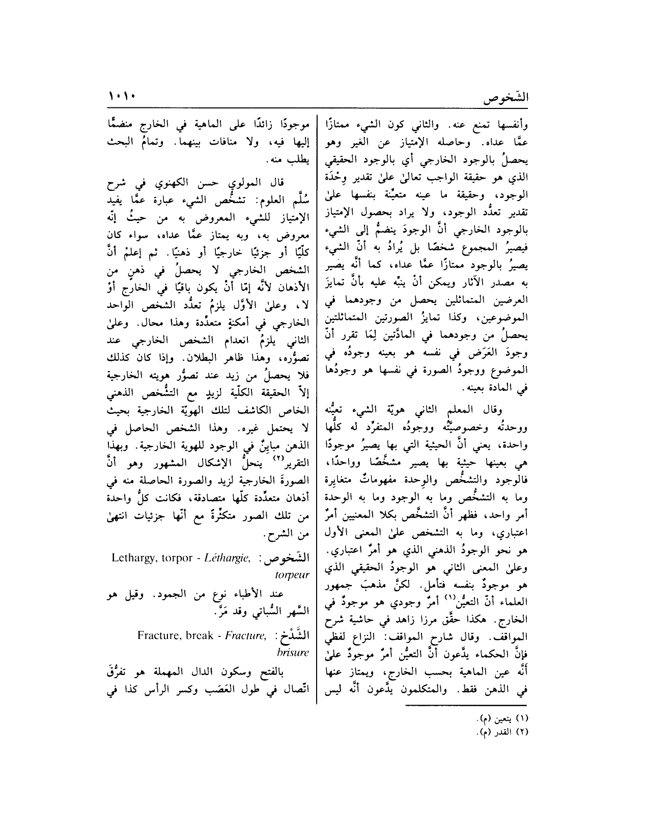 قال المولوي حسن اللكهنوي في شرح سلّم العلوم: تشخّص الشيء عبارة عمّا يفيد الامتياز للشيء المعروض به من حيث إنّه معروض به، وبه يمتاز عمّا عداه، سواء كان كلّيا أو جزئيا خارجيا أو ذهنيا. ثم اعلم أنّ الشخص الخارجي لا يحصل في ذهن من الأذهان لأنّه إمّا أن يكون باقيا في الخارج أو لا، وعلى الأوّل يلزم تعدّد الشخص الواحد الخارجي في أمكنة متعدّدة وهذا محال. وعلى الثاني يلزم انعدام الشخص الخارجي عند تصوّره، وهذا ظاهر البطلان. وإذا كان كذلك فلا يحصل من زيد عند تصوّر هويته الخارجية إلّا الحقيقة الكلّية لزيد مع التشخّص الذهني الخاص الكاشف لتلك الهويّة الخارجية بحيث لا يحتمل غيره. وهذا الشخص الحاصل في الذهن مباين في الوجود للهوية الخارجية. وبهذا التقرير «2» ينحلّ الإشكال المشهور وهو أنّ الصورة الخارجية لزيد والصورة الحاصلة منه في أذهان متعدّدة كلّها متصادقة، فكانت كلّ واحدة من تلك الصور متكثّرة مع أنّها جزئيات انتهى من الشرح.