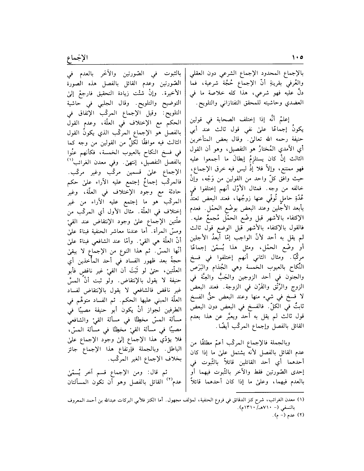 وبالجملة فالإجماع المركّب أعمّ مطلقا من عدم القائل بالفصل لأنه يشتمل على ما إذا كان أحدهما أي أحد القائلين قائلا بالثّبوت في إحدى الصّورتين فقط والآخر بالثّبوت فيهما أو بالعدم فيهما، وعلى ما إذا كان أحدهما قائلا بالثبوت في الصّورتين والآخر بالعدم في الصّورتين وعدم القائل بالفصل هذه الصورة الأخيرة. وإن شئت زيادة التحقيق فارجع إلى التوضيح والتلويح. وقال الجلبي في حاشية التلويح: وقيل الإجماع المركّب الاتفاق في الحكم مع الاختلاف في العلّة، وعدم القول بالفصل هو الإجماع المركّب الذي يكون القول الثالث فيه موافقا لكلّ من القولين من وجه كما في فسخ النكاح بالعيوب الخمسة، فكأنهم عنوا بالفصل التفصيل، انتهى. وفي معدن الغرائب «1» الإجماع على قسمين مركّب وغير مركّب.