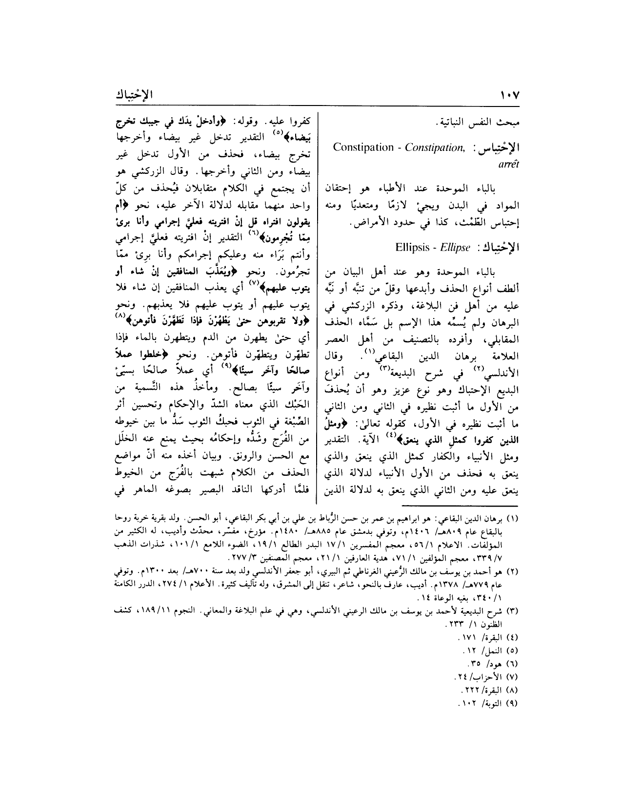بالباء الموحدة وهو عند أهل البيان من ألطف أنواع الحذف وأبدعها وقلّ من تنبّه أو نبّه عليه من أهل فن البلاغة، وذكره الزركشي في البرهان ولم يسمّه هذا الاسم بل سمّاه الحذف المقابلي، وأفرده بالتصنيف من أهل العصر العلامة برهان الدين البقاعي «1». وقال الأندلسي «2» في شرح البديعة «3» ومن أنواع البديع الاحتباك وهو نوع عزيز وهو أن يحذف من الأول ما أثبت نظيره في الثاني ومن الثاني ما أثبت نظيره في الأول، كقوله تعالى: وَمَثَلُ الَّذِينَ كَفَرُوا كَمَثَلِ الَّذِي يَنْعِقُ «4» الآية. التقدير ومثل الأنبياء والكفار كمثل الذي ينعق والذي ينعق به فحذف من الأول الأنبياء لدلالة الذي ينعق عليه ومن الثاني الذي ينعق به لدلالة الذين كفروا عليه. وقوله: وَأَدْخِلْ يَدَكَ فِي جَيْبِكَ تَخْرُجْ بَيْضاءَ «5» التقدير تدخل غير بيضاء وأخرجها تخرج بيضاء، فحذف من الأول تدخل غير بيضاء ومن الثاني وأخرجها. وقال الزركشي هو أن يجتمع في الكلام متقابلان فيحذف من كلّ واحد منهما مقابله لدلالة الآخر عليه، نحو أَمْ يَقُولُونَ افْتَراهُ قُلْ إِنِ افْتَرَيْتُهُ فَعَلَيَّ إِجْرامِي وَأَنَا بَرِيءٌ مِمَّا تُجْرِمُونَ «6» التقدير إن افتريته فعليّ إجرامي وأنتم براء منه وعليكم إجرامكم وأنا برئ ممّا تجرمون. ونحو وَيُعَذِّبَ الْمُنافِقِينَ إِنْ شاءَ أَوْ يَتُوبَ عَلَيْهِمْ «7» أي يعذب المنافقين إن شاء فلا يتوب عليهم أو يتوب عليهم فلا يعذبهم. ونحو وَلا تَقْرَبُوهُنَّ حَتَّى يَطْهُرْنَ فَإِذا تَطَهَّرْنَ فَأْتُوهُنَ «8» أي حتى يطهرن من الدم ويتطهرن بالماء فإذا تطهّرن ويتطهّرن فأتوهن. ونحو خَلَطُوا عَمَلًا صالِحاً وَآخَرَ سَيِّئاً «9» أي عملا صالحا بسيّئ وآخر سيئا بصالح. ومأخذ هذه التّسمية من الحبك الذي معناه الشدّ والإحكام وتحسين أثر الصّبغة في الثوب فحبك الثوب سدّ ما بين خيوطه من الفرج وشدّه وإحكامه بحيث يمنع عنه الخلل مع الحسن والرونق. وبيان أخذه منه أنّ مواضع الحذف من الكلام شبهت بالفرج من الخيوط فلمّا أدركها الناقد البصير بصوغه الماهر في