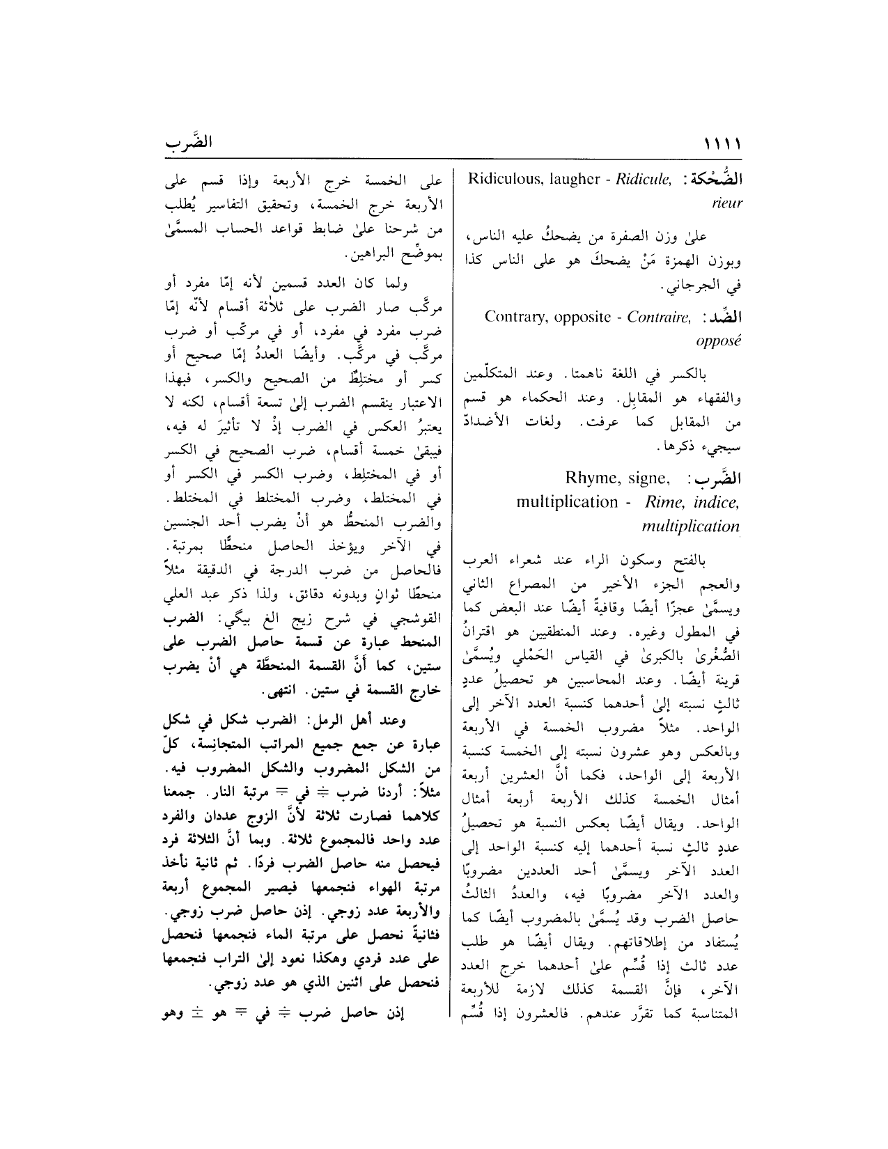بالفتح وسكون الراء عند شعراء العرب والعجم الجزء الأخير من المصراع الثاني ويسمّى عجزا أيضا وقافية أيضا عند البعض كما في المطول وغيره. وعند المنطقيين هو اقتران الصّغرى بالكبرى في القياس الحملي ويسمّى قرينة أيضا. وعند المحاسبين هو تحصيل عدد ثالث نسبته إلى أحدهما كنسبة العدد الآخر إلى الواحد. مثلا مضروب الخمسة في الأربعة وبالعكس وهو عشرون نسبته إلى الخمسة كنسبة الأربعة إلى الواحد، فكما أنّ العشرين أربعة أمثال الخمسة كذلك الأربعة أربعة أمثال الواحد. ويقال أيضا بعكس النسبة هو تحصيل عدد ثالث نسبة أحدهما إليه كنسبة الواحد إلى العدد الآخر ويسمّى أحد العددين مضروبا والعدد الآخر مضروبا فيه، والعدد الثالث حاصل الضرب وقد يسمّى بالمضروب أيضا كما يستفاد من إطلاقاتهم. ويقال أيضا هو طلب عدد ثالث إذا قسّم على أحدهما خرج العدد الآخر، فإنّ القسمة كذلك لازمة للأربعة المتناسبة كما تقرّر عندهم. فالعشرون إذا قسّم على الخمسة خرج الأربعة وإذا قسم على الأربعة خرج الخمسة، وتحقيق التفاسير يطلب من شرحنا على ضابط قواعد الحساب المسمّى بموضّح البراهين.