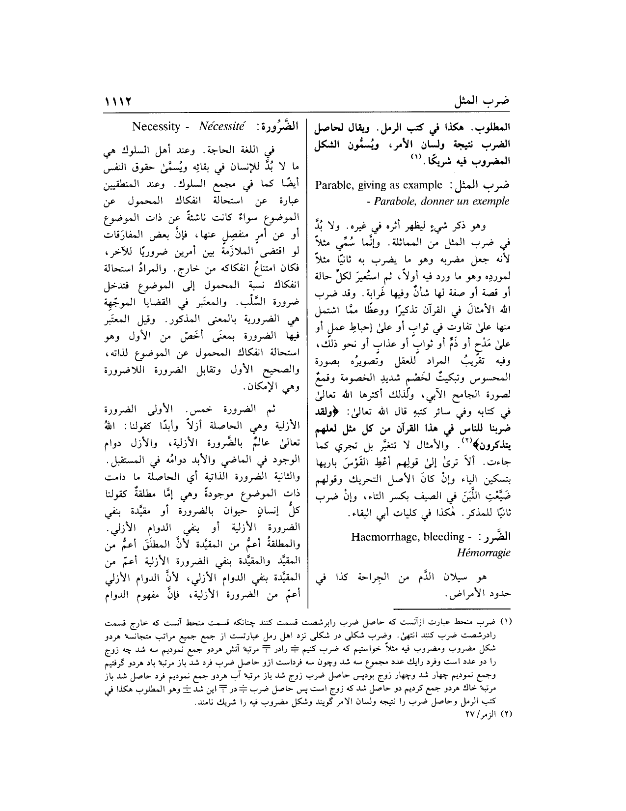 وهو ذكر شيء ليظهر أثره في غيره. ولا بدّ في ضرب المثل من المماثلة. وإنّما سمّي مثلا لأنه جعل مضربه وهو ما يضرب به ثانيا مثلا لمورده وهو ما ورد فيه أولا، ثم استعير لكلّ حالة أو قصة أو صفة لها شأن وفيها غرابة. وقد ضرب الله الأمثال في القرآن تذكيرا ووعظا ممّا اشتمل منها على تفاوت في ثواب أو على إحباط عمل أو على مدح أو ذمّ أو ثواب أو عذاب أو نحو ذلك، وفيه تقريب المراد للعقل وتصويره بصورة المحسوس وتبكيت لخصم شديد الخصومة وقمع لصورة الجامح الآبي، ولذلك أكثرها الله تعالى في كتابه وفي سائر كتبه قال الله تعالى: وَلَقَدْ ضَرَبْنا لِلنَّاسِ فِي هذَا الْقُرْآنِ مِنْ كُلِّ مَثَلٍ لَعَلَّهُمْ يَتَذَكَّرُونَ «2». والأمثال لا تتغيّر بل تجري كما جاءت. ألا ترى إلى قولهم أعط القوس باريها بتسكين الياء وإن كان الأصل التحريك وقولهم ضيّعت اللّبن في الصيف بكسر التاء، وإن ضرب ثانيا للمذكر. هكذا في كليات أبي البقاء.