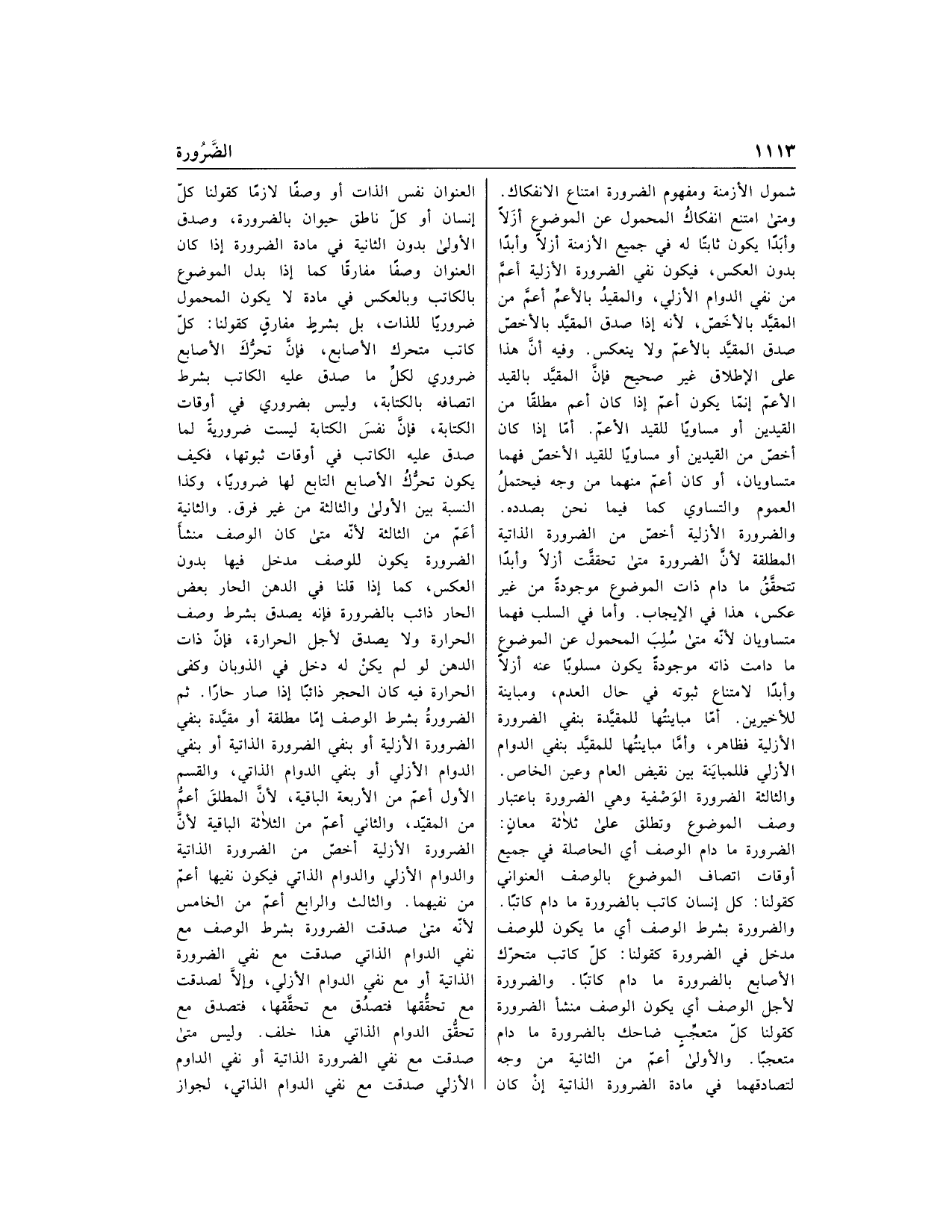 والضرورة بشرط الوصف أي ما يكون للوصف مدخل في الضرورة كقولنا: كلّ كاتب متحرّك الأصابع بالضرورة ما دام كاتبا. والضرورة لأجل الوصف أي يكون الوصف منشأ الضرورة كقولنا كلّ متعجّب ضاحك بالضرورة ما دام متعجبا. والأولى أعمّ من الثانية من وجه لتصادقهما في مادة الضرورة الذاتية إن كان العنوان نفس الذات أو وصفا لازما كقولنا كلّ إنسان أو كلّ ناطق حيوان بالضرورة، وصدق الأولى بدون الثانية في مادة الضرورة إذا كان العنوان وصفا مفارقا كما إذا يدل الموضوع بالكاتب وبالعكس في مادة لا يكون المحمول ضروريا للذات، بل بشرط مفارق كقولنا: كلّ كاتب متحرك الأصابع، فإنّ تحرّك الأصابع ضروري لكلّ ما صدق عليه الكاتب بشرط اتصافه بالكتابة، وليس بضروري في أوقات الكتابة، فإنّ نفس الكتابة ليست ضرورية لما صدق عليه الكاتب في أوقات ثبوتها، فكيف يكون تحرّك الأصابع التابع لها ضروريا، وكذا النسبة بين الأولى والثالثة من غير فرق. والثانية أعمّ من الثالثة لأنّه متى كان الوصف منشأ الضرورة يكون للوصف مدخل فيها بدون العكس، كما إذا قلنا في الدهن الحار بعض الحار ذائب بالضرورة فإنه يصدق بشرط وصف الحرارة ولا يصدق لأجل الحرارة، فإنّ ذات الدهن لو لم يكن له دخل في الذوبان وكفى الحرارة فيه كان الحجر ذائبا إذا صار حارا. ثم الضرورة بشرط الوصف إمّا مطلقة أو مقيّدة بنفي الضرورة الأزلية أو بنفي الضرورة الذاتية أو بنفي الدوام الأزلي أو بنفي الدوام الذاتي، والقسم الأول أعمّ من الأربعة الباقية، لأنّ المطلق أعمّ من المقيّد، والثاني أعمّ من الثلاثة الباقية لأنّ الضرورة الأزلية أخصّ من الضرورة الذاتية والدوام الأزلي والدوام الذاتي فيكون نفيها أعمّ من نفيهما. والثالث والرابع أعمّ من الخامس لأنّه متى صدقت الضرورة بشرط الوصف مع نفي الدوام الذاتي صدقت مع نفي الضرورة الذاتية أو مع نفي الدوام الأزلي، وإلّا لصدقت مع تحقّقها فتصدق مع تحقّقها، فتصدق مع تحقّق الدوام الذاتي هذا خلف. وليس متى صدقت مع نفي الضرورة الذاتية أو نفي الدوام الأزلي صدقت مع نفي الدوام الذاتي، لجواز