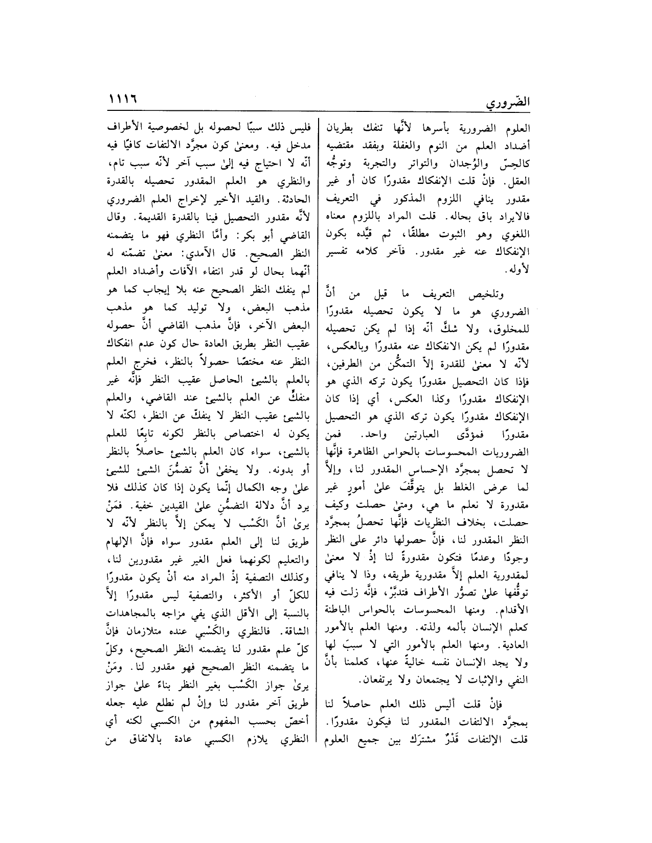 قلت الالتفات قدر مشترك بين جميع العلوم فليس ذلك سببا لحصوله بل لخصوصية الأطراف مدخل فيه. ومعنى كون مجرّد الالتفات كافيا فيه أنّه لا احتياج فيه إلى سبب آخر لأنّه سبب تام، والنظري هو العلم المقدور تحصيله بالقدرة الحادثة. والقيد الأخير لإخراج العلم الضروري لأنّه مقدور التحصيل فينا بالقدرة القديمة. وقال القاضي أبو بكر: وأمّا النظري فهو ما يتضمنه النظر الصحيح. قال الآمدي: معنى تضمّنه له أنّهما بحال لو قدر انتفاء الآفات وأضداد العلم لم ينفك النظر الصحيح عنه بلا إيجاب كما هو مذهب البعض، ولا توليد كما هو مذهب البعض الآخر، فإنّ مذهب القاضي أنّ حصوله عقيب النظر بطريق العادة حال كون عدم انفكاك النظر عنه مختصا حصولا بالنظر، فخرج العلم بالعلم بالشيء الحاصل عقيب النظر فإنّه غير منفكّ عن العلم بالشيء عند القاضي، والعلم بالشيء عقيب النظر لا ينفكّ عن النظر، لكنّه لا يكون له اختصاص بالنظر لكونه تابعا للعلم بالشيء، سواء كان العلم بالشيء حاصلا بالنظر أو بدونه. ولا يخفى أنّ تضمّن الشيء للشيء على وجه الكمال إنّما يكون إذا كان كذلك فلا يرد أنّ دلالة التضمّن على القيدين خفية. فمن يرى أنّ الكسب لا يمكن إلّا بالنظر لأنّه لا طريق لنا إلى العلم مقدور سواه فإنّ الإلهام والتعليم لكونهما فعل الغير غير مقدورين لنا، وكذلك التصفية إذ المراد منه أن يكون مقدورا للكلّ أو الأكثر، والتصفية ليس مقدورا إلّا بالنسبة إلى الأقل الذي يفي مزاجه بالمجاهدات الشاقة. فالنظري والكسبي عنده متلازمان فإنّ كلّ علم مقدور لنا يتضمنه النظر الصحيح، وكلّ ما يتضمنه النظر الصحى فهو مقدور لنا. ومن يرى جواز الكسب بغير النظر بناء على جواز طريق آخر مقدور لنا وإن لم نطلع عليه جعله أخصّ بحسب المفهوم من الكسبي لكنه أي النظري يلازم الكسبي عادة بالاتفاق من