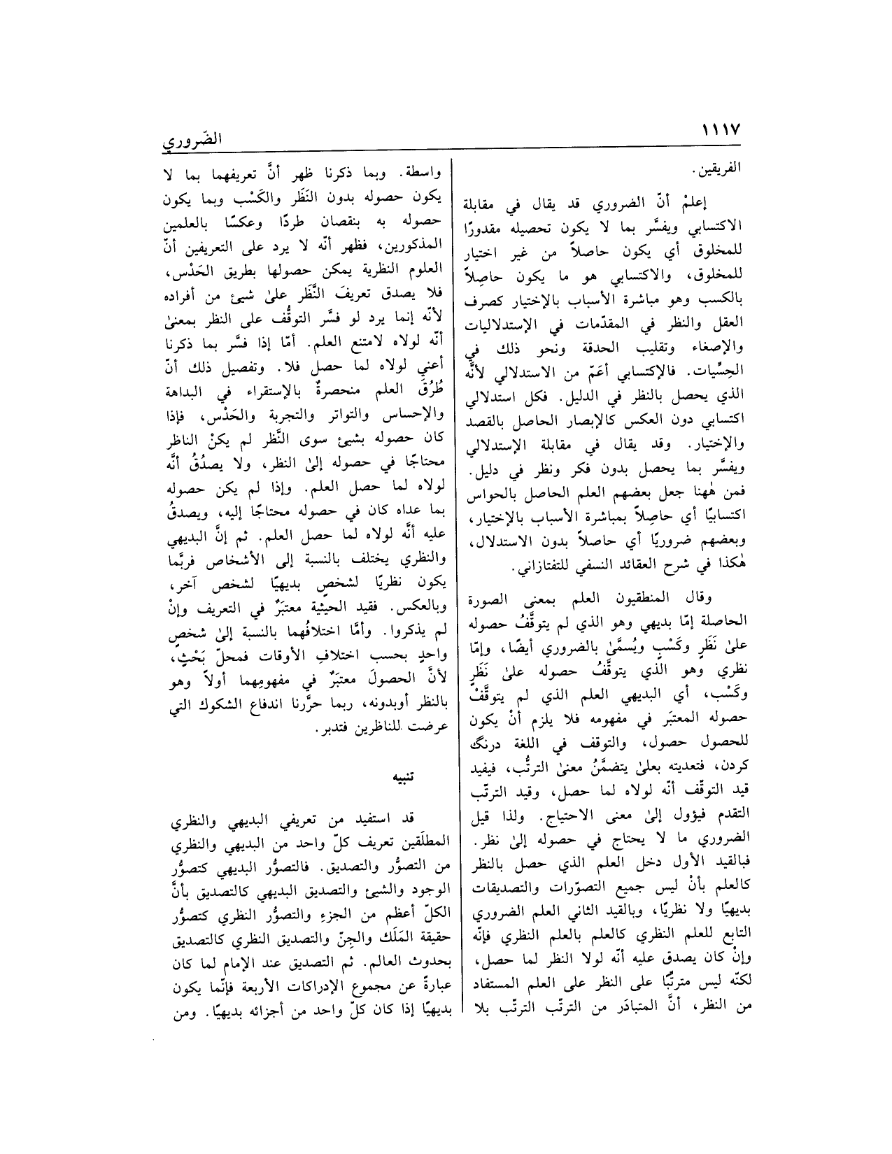 وقال المنطقيون العلم بمعنى الصورة الحاصلة إمّا بديهي وهو الذي لم يتوقّف حصوله على نظر وكسب ويسمّى بالضروري أيضا، وإمّا نظري وهو الذي يتوقّف حصوله على نظر وكسب، أي البديهي العلم الذي لم يتوقّف حصوله المعتبر في مفهومه فلا يلزم أن يكون للحصول حصول، والتوقف في اللغة درنگ كردن، فتعديته بعلى يتضمّن معنى الترتّب، فيفيد قيد التوقّف أنّه لولاه لما حصل، وقيد الترتّب التقدم فيؤول إلى معنى الاحتياج. ولذا قيل الضروري ما لا يحتاج في حصوله إلى نظر.