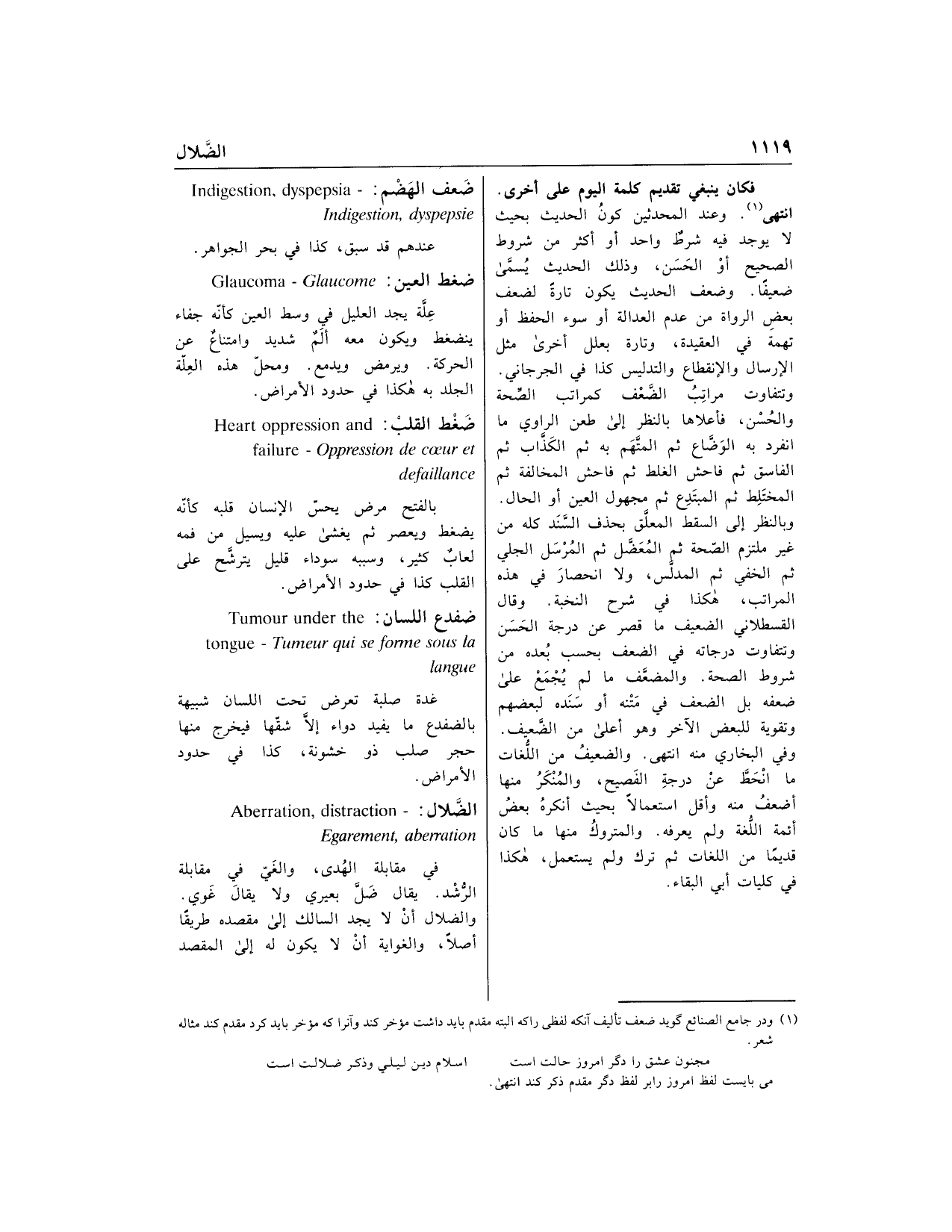 انتهى «1». وعند المحدثين كون الحديث بحيث لا يوجد فيه شرط واحد أو أكثر من شروط الصحيح أو الحسن، وذلك الحديث يسمّى ضعيفا. وضعف الحديث يكون تارة لضعف بعض الرواة من عدم العدالة أو سوء الحفظ أو تهمة في العقيدة، وتارة بعلل أخرى مثل الإرسال والانقطاع والتدليس كذا في الجرجاني.