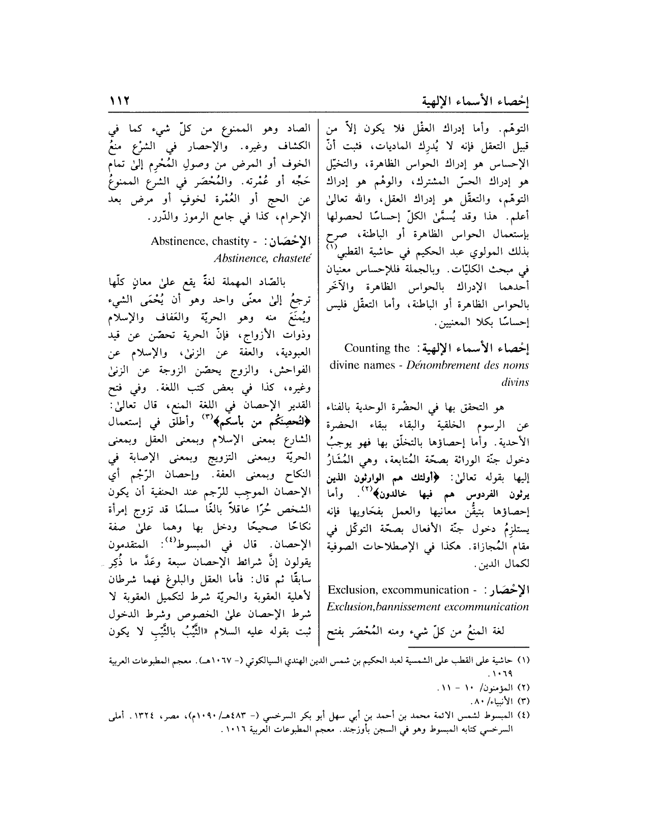 هو التحقق بها في الحضرة الوحدية بالفناء عن الرسوم الخلقية والبقاء ببقاء الحضرة الأحدية. وأما إحصاؤها بالتخلّق بها فهو يوجب دخول جنّة الوراثة بصحّة المتابعة، وهي المشار إليها بقوله تعالى: أُولئِكَ هُمُ الْوارِثُونَ الَّذِينَ يَرِثُونَ الْفِرْدَوْسَ هُمْ فِيها خالِدُونَ «2». وأما إحصاؤها بتيقّن معانيها والعمل بفحاويها فإنه يستلزم دخول جنّة الأفعال بصحّة التوكّل في مقام المجازاة. هكذا في الاصطلاحات الصوفية لكمال الدين.