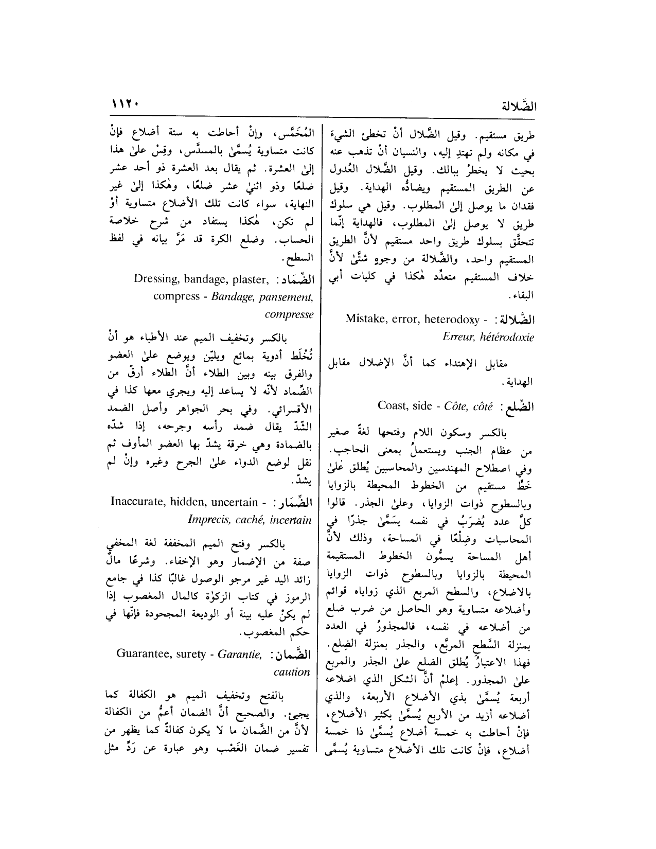 فهذا الاعتبار يطلق الضلع على الجذر والمربع على المجذور. اعلم أنّ الشكل الذي اضلاعه أربعة يسمّى بذي الأضلاع الأربعة، والذي أضلاعه أزيد من الأربع يسمّى بكثير الأضلاع، فإن أحاطت به خمسة أضلاع يسمّى ذا خمسة أضلاع، فإن كانت تلك الأضلاع متساوية يسمّى المخمّس، وإن أحاطت به ستة أضلاع فإن كانت متساوية يسمّى بالمسدّس، وقس على هذا إلى العشرة. ثم يقال بعد العشرة ذو أحد عشر ضلعا وذو اثني عشر ضلعا، وهكذا إلى غير النهاية، سواء كانت تلك الأضلاع متساوية أو لم تكن، هكذا يستفاد من شرح خلاصة الحساب. وضلع الكرة قد مرّ بيانه في لفظ السطح.