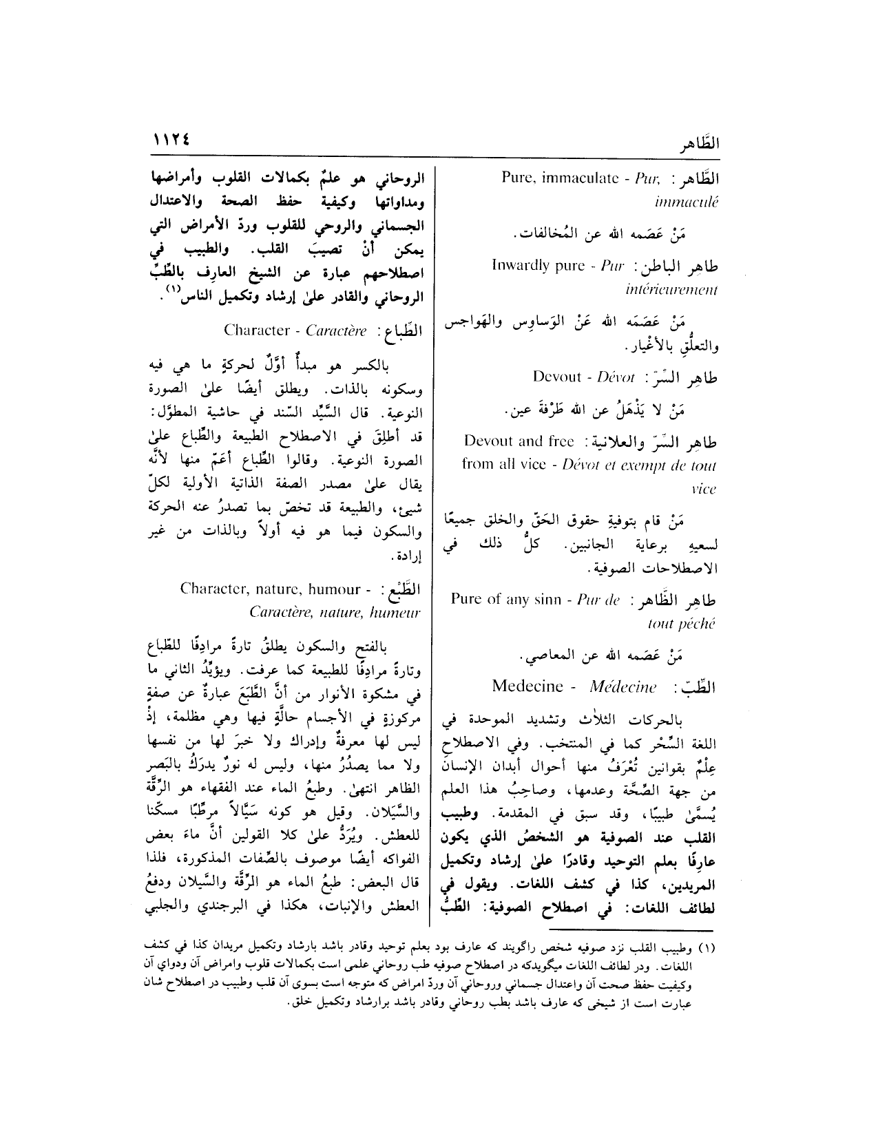 (1) وطبيب القلب نزد صوفيه شخص را گويند كه عارف بود بعلم توحيد وقادر باشد بارشاد وتكميل مريدان كذا في كشف اللغات. ودر لطائف اللغات ميگويد كه در اصطلاح صوفيه طب روحاني علمى است بكمالات قلوب وامراض آن ودواى آن وكيفيت حفظ صحت آن واعتدال جسماني وروحاني آن وردّ امراض كه متوجه است به سوى آن قلب وطبيب در اصطلاح شان عبارت است از شيخى كه عارف باشد بطب روحاني وقادر باشد بر ارشاد وتكميل خلق.
