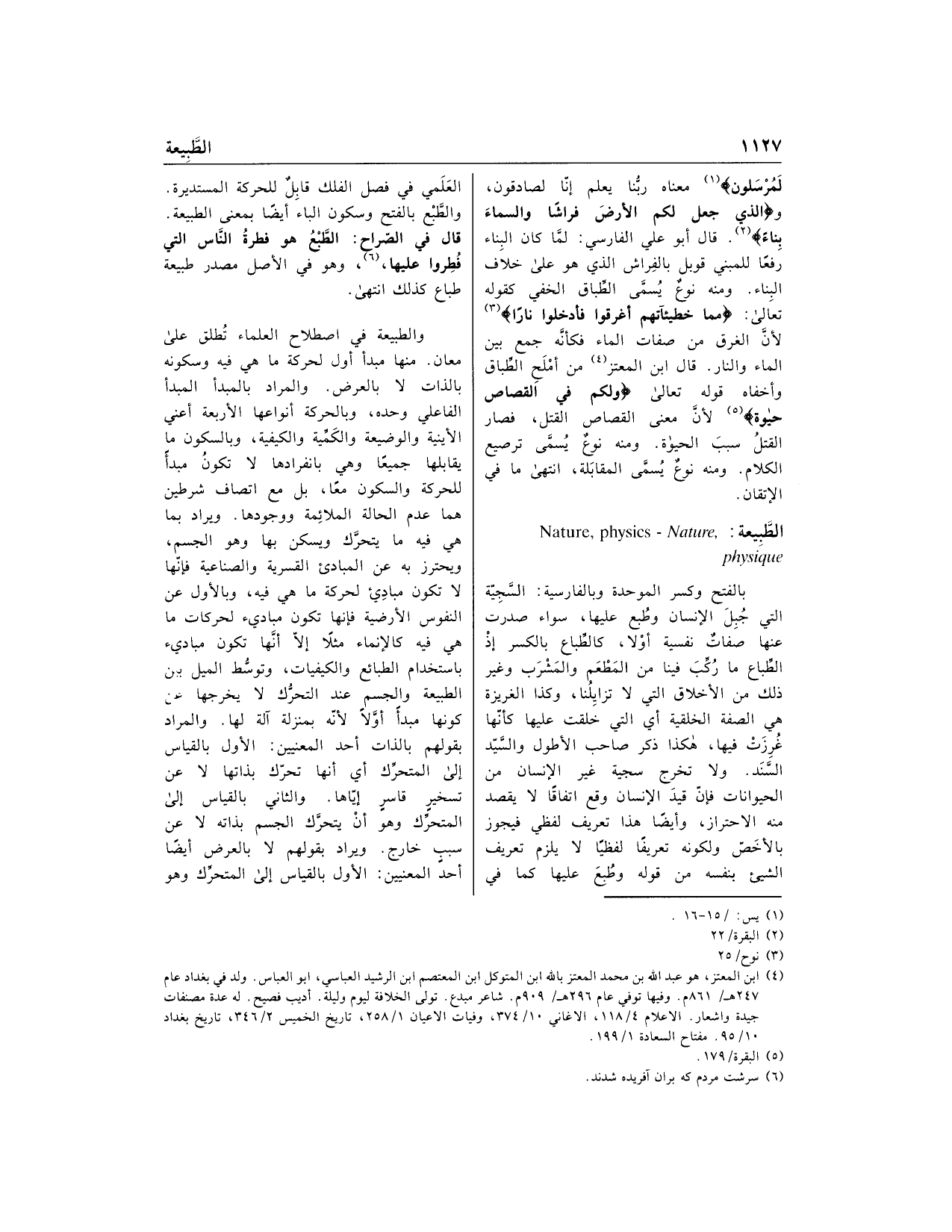 والطبيعة في اصطلاح العلماء تطلق على معان. منها مبدأ أول لحركة ما هي فيه وسكونه بالذات لا بالعرض. والمراد بالمبدإ المبدأ الفاعلي وحده، وبالحركة أنواعها الأربعة أعني الأينية والوضيعة والكمّية والكيفية، وبالسكون ما يقابلها جميعا وهي بانفرادها لا تكون مبدأ للحركة والسكون معا، بل مع اتصاف شرطين هما عدم الحالة الملائمة ووجودها. ويراد بما هي فيه ما يتحرّك ويسكن بها وهو الجسم، ويحترز به عن المبادئ القسرية والصناعية فإنّها لا تكون مبادي لحركة ما هي فيه، وبالأول عن النفوس الأرضية فإنها تكون مبادي لحركات ما هي فيه كالإنماء مثلا إلّا أنّها تكون مبادي باستخدام الطبائع والكيفيات، وتوسّط الميل بين الطبيعة والجسم عند التحرّك لا يخرجها عن كونها مبدأ أوّلا لأنّه بمنزلة آلة لها. والمراد بقولهم بالذات أحد المعنيين: الأول بالقياس إلى المتحرّك أي أنها تحرّك بذاتها لا عن تسخير قاسر إيّاها. والثاني بالقياس إلى المتحرّك وهو أن يتحرّك الجسم بذاته لا عن سبب خارج. ويراد بقولهم لا بالعرض أيضا أحد المعنيين: الأول بالقياس إلى المتحرّك وهو
