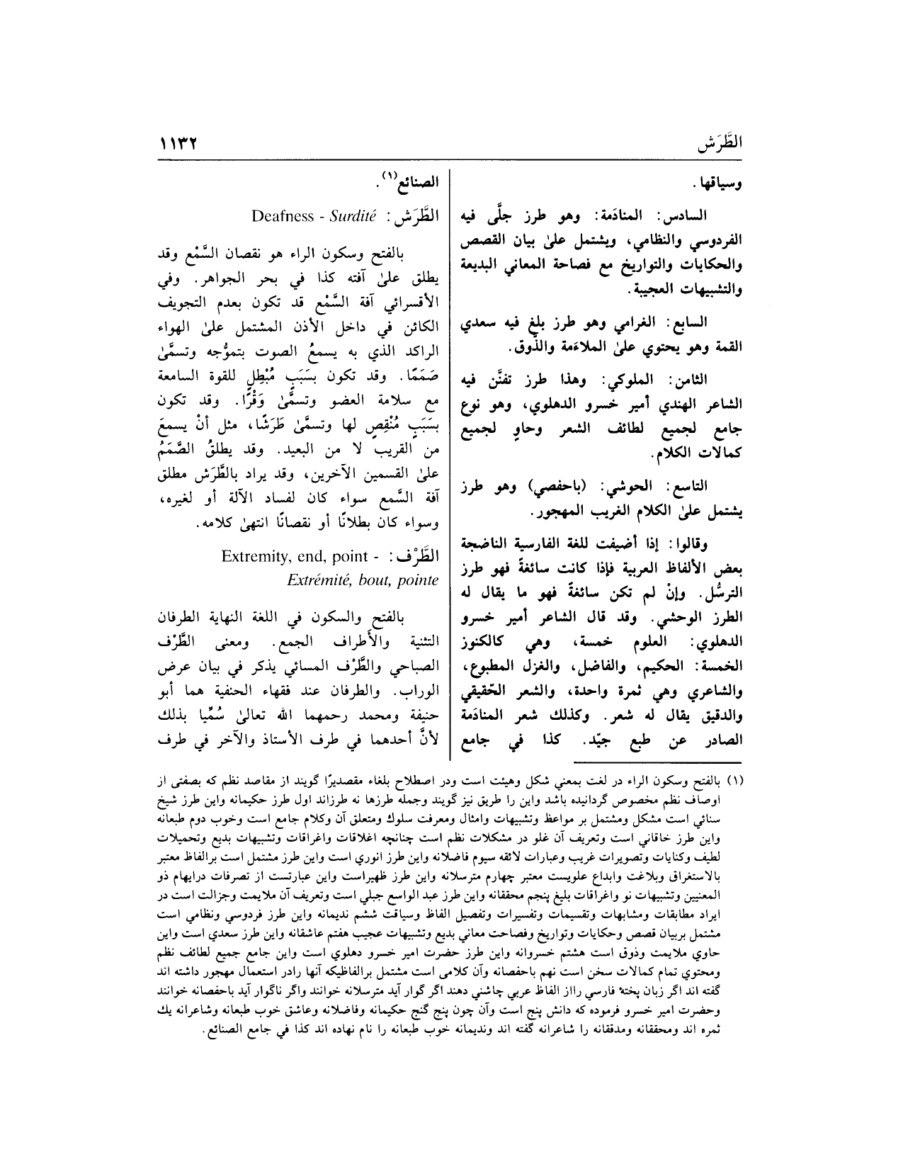 بالفتح وسكون الراء هو نقصان السّمع وقد يطلق على آفته كذا في بحر الجواهر. وفي الأقسرائي آفة السّمع قد تكون بعدم التجويف الكائن في داخل الأذن المشتمل على الهواء الراكد الذي به يسمع الصوت بتموّجه وتسمّى صمما. وقد تكون بسبب مبطل للقوة السامعة مع سلامة العضو وتسمّى وقرا. وقد تكون بسبب منقص لها وتسمّى طرشا، مثل أن يسمع من القريب لا من البعيد. وقد يطلق الصّمم على القسمين الآخرين، وقد يراد بالطّرش مطلق آفة السّمع سواء كان لفساد الآلة أو لغيره، وسواء كان بطلانا أو نقصانا انتهى كلامه.