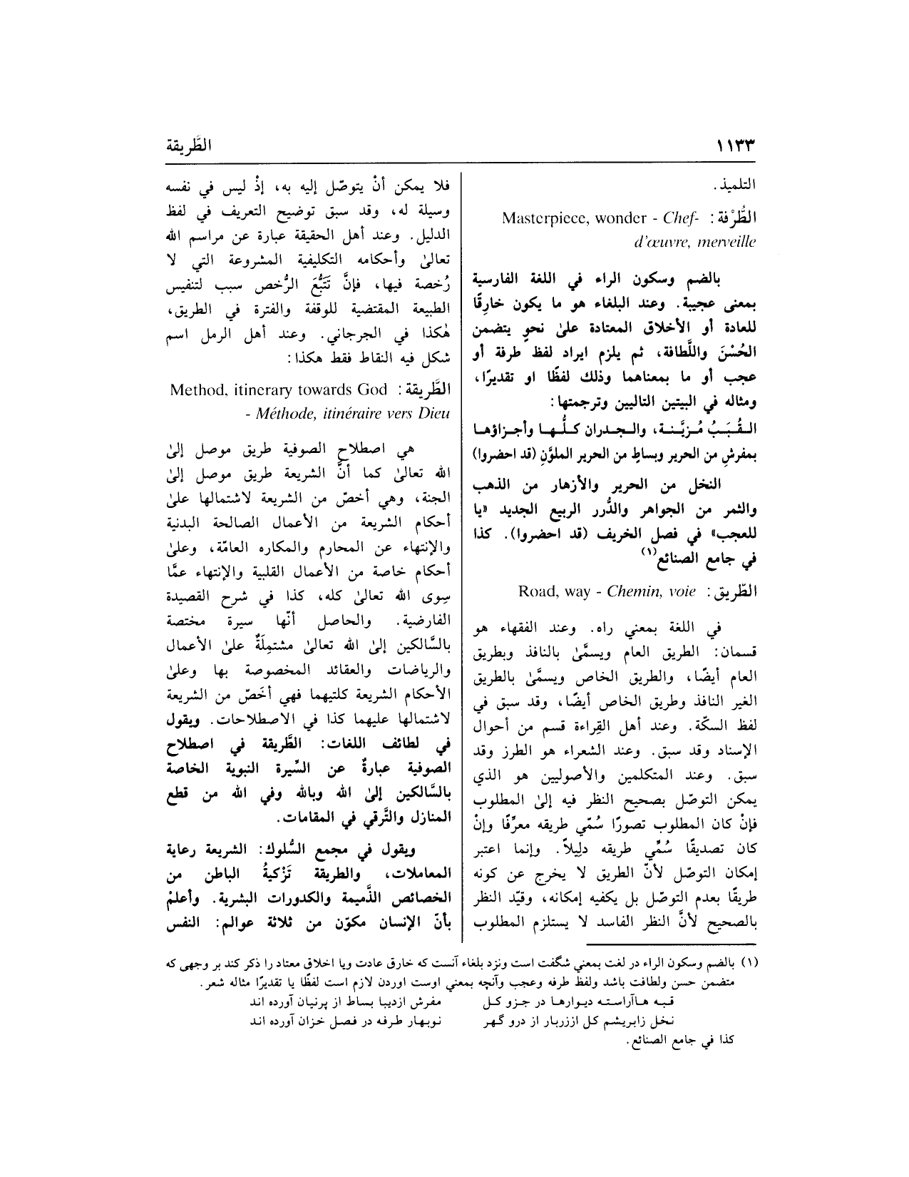 في اللغة بمعني راه. وعند الفقهاء هو قسمان: الطريق العام ويسمّى بالنافذ وبطريق العام أيضا، والطريق الخاص ويسمّى بالطريق الغير النافذ وطريق الخاص أيضا، وقد سبق في لفظ السكّة. وعند أهل القراءة قسم من أحوال الإسناد وقد سبق. وعند الشعراء هو الطرز وقد سبق. وعند المتكلمين والأصوليين هو الذي يمكن التوصّل بصحيح النظر فيه إلى المطلوب فإن كان المطلوب تصورا سمّي طريقه معرّفا وإن كان تصديقا سمّي طريقه دليلا. وإنما اعتبر إمكان التوصّل لأنّ الطريق لا يخرج عن كونه طريقا بعدم التوصّل بل يكفيه إمكانه، وقيّد النظر بالصحيح لأنّ النظر الفاسد لا يستلزم المطلوب فلا يمكن أن يتوصّل إليه به، إذ ليس في نفسه وسيلة له، وقد سبق توضيح التعريف في لفظ الدليل. وعند أهل الحقيقة عبارة عن مراسم الله تعالى وأحكامه التكليفية المشروعة التي لا رخصة فيها، فإنّ تتبّع الرّخص سبب لتنفيس الطبيعة المقتضية للوقفة والفترة في الطريق، هكذا في الجرجاني. وعند أهل الرمل اسم شكل فيه النقاط فقط هكذا: