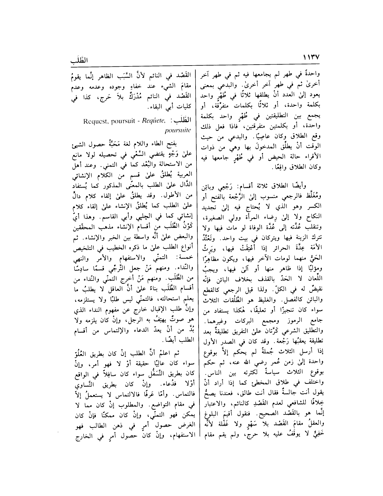 بفتح الطاء واللام لغة محبّة حصول الشيء على وجه يقتضي السّعي في تحصيله لولا مانع من الاستحالة والبعد كما في التمني. وعند أهل العربية يطلق على قسم من الكلام الإنشائي الدّال على الطلب بالمعنى المذكور كما يستفاد من الأطول. وقد يطلق على إلقاء كلام دالّ على الطلب كما يطلق الإنشاء على إلقاء كلام إنشائي كما في الچلپي وأبي القاسم. وهذا أيّ كون الطّلب من أقسام الإنشاء مذهب المحقّقين والبعض على أنّه واسطة بين الخبر والإنشاء. ثم أنواع الطلب على ما ذكره الخطيب في التلخيص خمسة: التمنّي والاستفهام والأمر والنهي والنّداء. ومنهم من جعل التّرجّي قسما سادسا من الطّلب. ومنهم من جعل التّرجّي قسما سادسا من الطّلب. ومنهم من أخرج التمنّي والنّداء من أقسام الطّلب بناء على أنّ العاقل لا يطلب ما يعلم استحالته، فالتمنّي ليس طلبا ولا يستلزمه، وإنّ طلب الإقبال خارج عن مفهوم النداء الذي هو صوت يهتف به الرجل، وإن كان يلزمه ولا بدّ من أن يعدّ الدعاء والالتماس من أقسام الطلب أيضا.