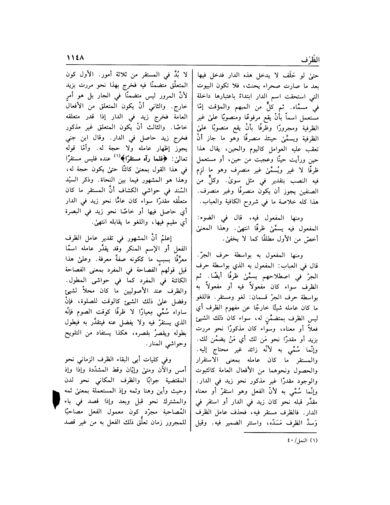 وإنّما سمّي به لأنّ الفعل وهو استقرّ أو معناه مقدّر قبله نحو كان زيد في الدار أو استقر في الدار. فالظرف مستقر فيه، فحذف عامل الظرف وسدّ الظرف مسدّه، واستتر الضمير فيه. وقيل لا بدّ في المستقر من ثلاثة أمور. الأول كون المتعلّق متضمنا فيه فخرج بهذا نحو مررت بزيد لأنّ المرور ليس متضمنا في الجار بل هو أمر خارج. والثاني أن يكون المتعلق من الأفعال العامة فخرج زيد في الدار إذا قدر متعلقه خاصا. والثالث أن يكون المتعلق غير مذكور فخرج زيد حاصل في الدار. وقال ابن جني يجوز إظهار عامله ولا حجة له. وأمّا قوله تعالى: فَلَمَّا رَآهُ مُسْتَقِرًّا «1» عنده فليس مستقرا في هذا القول بمعنى كائنا حتى يكون حجة له، وهذا هو المشهور فيما بين النحاة. وذكر السيّد السّند في حواشي الكشاف أنّ المستقر ما كان متعلّقه مقدرا سواء كان عامّا نحو زيد في الدار أي حاصل فيها أو خاصا نحو زيد في البصرة أي مقيم فيها، واللغو ما يقابله انتهى.