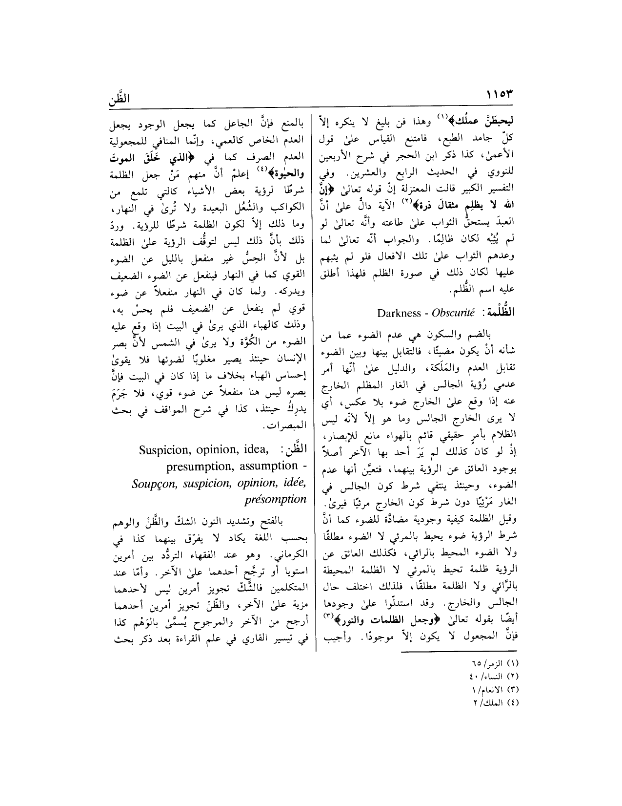 بالضم والسكون هي عدم الضوء عما من شأنه أن يكون مضيئا، فالتقابل بينها وبين الضوء تقابل العدم والملكة، والدليل على أنّها أمر عدمي رؤية الجالس في الغار المظلم الخارج عنه إذا وقع على الخارج ضوء بلا عكس، أي لا يرى الخارج الجالس وما هو إلّا لأنّه ليس الظلام بأمر حقيقي قائم بالهواء مانع للإبصار، إذ لو كان كذلك لم ير أحد بها الآخر أصلا بوجود العائق عن الرؤية بينهما، فتعيّن أنها عدم الضوء، وحينئذ ينتفي شرط كون الجالس في الغار مرئيا دون شرط كون الخارج مرئيا فيرى.