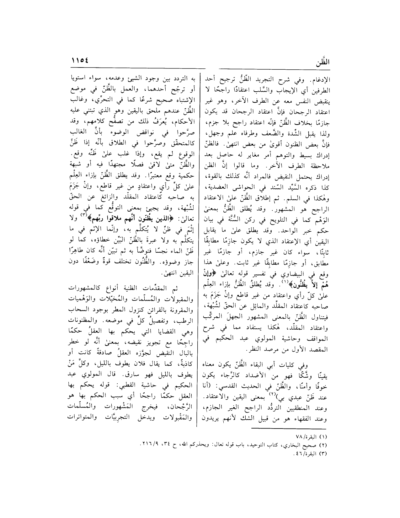 الإدغام. وفي شرح التجريد الظّنّ ترجيح أحد الطرفين أي الإيجاب والسّلب اعتقادا راجحا لا ينقبض النفس معه عن الطرف الآخر، وهو غير اعتقاد الرجحان فإنّ اعتقاد الرجحان قد يكون جازما بخلاف الظّنّ فإنّه اعتقاد راجح بلا جزم، ولذا يقبل الشّدة والضّعف وطرفاه علم وجهل، فإنّ بعض الظنون أقوى من بعض انتهى. فالظنّ إدراك بسيط والتوهم أمر مغاير له حاصل بعد ملاحظة الطرف الآخر. وما قالوا إنّ الظن إدراك يحتمل النقيض فالمراد أنّه كذلك بالقوة، كذا ذكره السّيّد السّند في الحواشى العضدية، وهكذا في السلم. ثم إطلاق الظّنّ على الاعتقاد الراجح هو المشهور. وقد يطلق الظّنّ بمعنى الوهم كما في التلويح في ركن السّنّة في بيان حكم خبر الواحد. وقد يطلق على ما يقابل اليقين أي الاعتقاد الذي لا يكون جازما مطابقا ثابتا، سواء كان غير جازم، أو جازما غير مطابق، أو جازما مطابقا غير ثابت. وعلى هذا وقع في البيضاوي في تفسير قوله تعالى وَإِنْ هُمْ إِلَّا يَظُنُّونَ «1». وقد يطلق الظّنّ بإزاء العلم على كلّ رأي واعتقاد من غير قاطع وإن جزم به صاحبه كاعتقاد المقلّد والمائل عن الحقّ لشبهة، فيتناول الظّنّ بالمعنى المشهور الجهل المركّب واعتقاد المقلّد، هكذا يستفاد مما في شرح المواقف وحاشية المولوي عبد الحكيم في المقصد الأول من مرصد النظر.