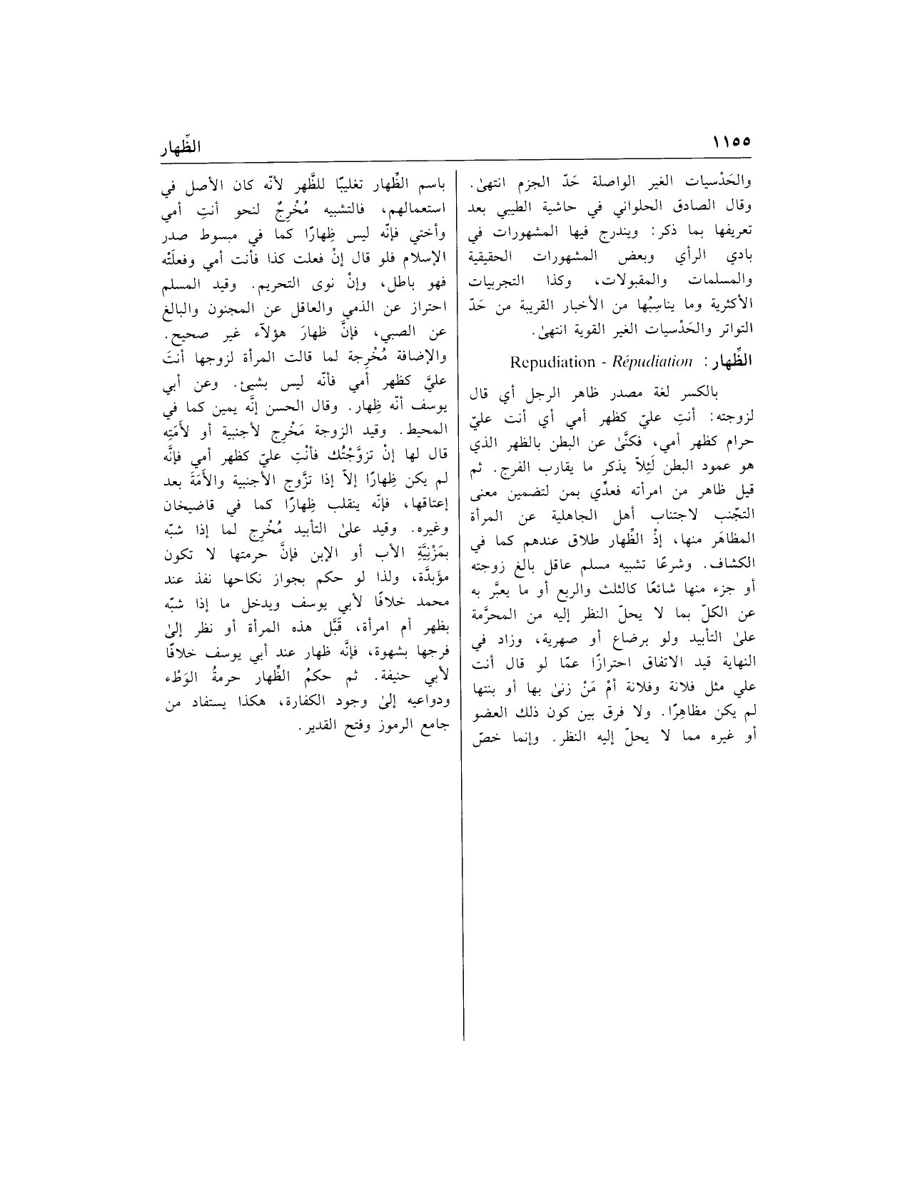 بالكسر لغة مصدر ظاهر الرجل أي قال لزوجته: أنت عليّ كظهر أمي أي أنت عليّ حرام كظهر أمي، فكنّى عن البطن بالظهر الذي هو عمود البطن لئلّا يذكر ما يقارب الفرج. ثم قيل ظاهر من امرأته فعدّي بمن لتضمين معنى التجنب لاجتناب أهل الجاهلية عن المرأة المظاهر منها، إذ الظّهار طلاق عندهم كما في الكشاف. وشرعا تشبيه مسلم عاقل بالغ زوجته أو جزء منها شائعا كالثلث والربع أو ما يعبّر به عن الكلّ بما لا يحلّ النظر إليه من المحرّمة على التأبيد ولو برضاع أو صهرية، وزاد في النهاية قيد الاتفاق احترازا عمّا لو قال أنت علي مثل فلانة وفلانة أم من زنى بها أو بنتها لم يكن مظاهرا. ولا فرق بين كون ذلك العضو أو غيره مما لا يحلّ إليه النظر. وإنما خصّ باسم الظّهار تغليبا للظّهر لأنّه كان الأصل في استعمالهم، فالتشبيه مخرج لنحو أنت أمي وأختي فإنّه ليس ظهارا كما في مبسوط صدر الإسلام فلو قال إن فعلت كذا فأنت أمي وفعلته فهو باطل، وإن نوى التحريم. وقيد المسلم احتراز عن الذمي والعاقل عن المجنون والبالغ عن الصبي، فإنّ ظهار هؤلاء غير صحيح.