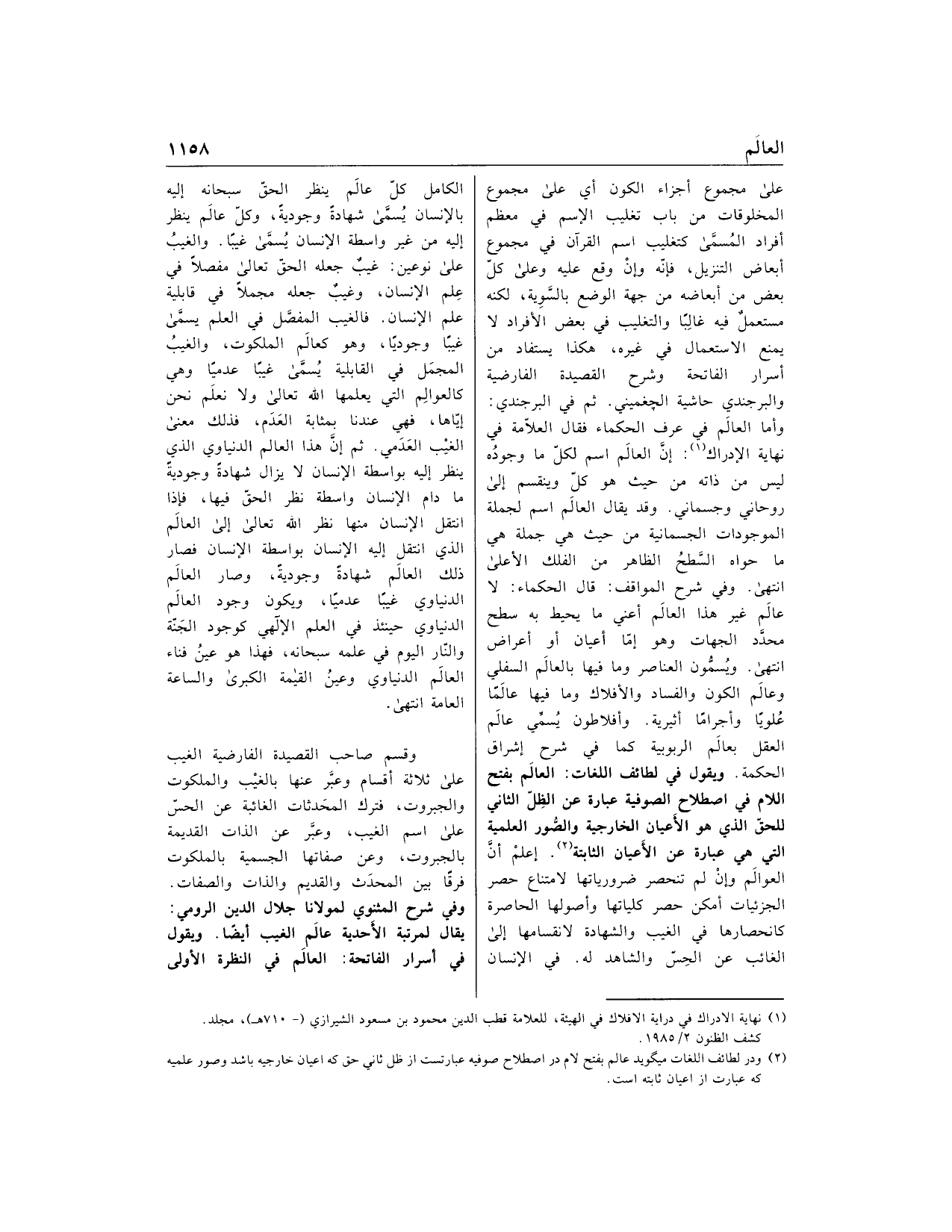 (2) ودر لطائف اللغات ميگويد عالم بفتح لام در اصطلاح صوفيه عبارتست از ظل ثاني حق كه اعيان خارجيه باشد وصور علميه كه عبارت از اعيان ثابته است.