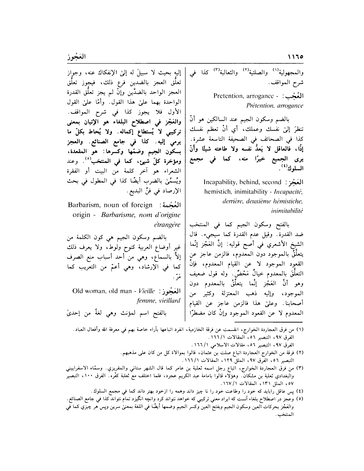 والعجز في اصطلاح البلغاء هو الإتيان بمعنى تركيبي لا يستطاع إكماله. ولا يحاط بكلّ ما يرمي إليه. كذا في جامع الصنائع. والعجز بسكون الجيم وضمّها وكسرها: هو المقعدة، ومؤخرة كلّ شيء، كما في المنتخب «5». وعند الشعراء هو آخر كلمة من البيت أو الفقرة ويسمّى بالضرب أيضا كذا في المطول في بحث الإرصاد في فنّ البديع.