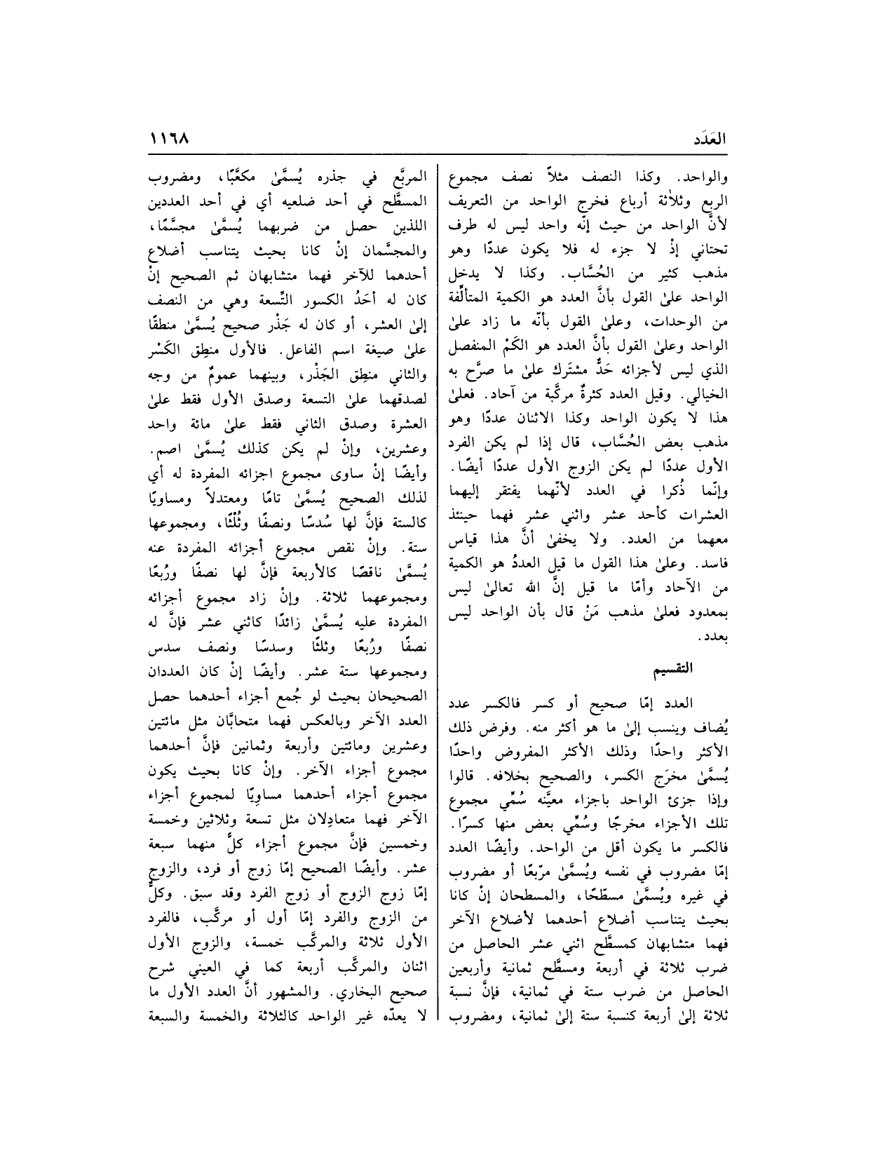 فالكسر ما يكون أقل من الواحد. وأيضا العدد إمّا مضروب في نفسه ويسمّى مربّعا أو مضروب في غيره ويسمّى مسطّحا، والمسطحان إن كانا بحيث يتناسب أضلاع أحدهما لأضلاع الآخر فهما متشابهان كمسطّح اثني عشر الحاصل من ضرب ثلاثة في أربعة ومسطّح ثمانية وأربعين الحاصل من ضرب ستة في ثمانية، فإنّ نسبة ثلاثة إلى أربعة كنسبة ستة إلى ثمانية، ومضروب المربّع في جذره يسمّى مكعّبا، ومضروب المسطّح في أحد ضلعيه أي في أحد العددين اللذين حصل من ضربهما يسمّى مجسّما، والمجسّمان إن كانا بحيث يتناسب أضلاع أحدهما للآخر فهما متشابهان ثم الصحيح إن كان له أحد الكسور التّسعة وهي من النصف إلى العشر، أو كان له جذر صحيح يسمّى منطقا على صيغة اسم الفاعل. فالأول منطق الكسر والثاني منطق الجذر، وبينهما عموم من وجه لصدقهما على التسعة وصدق الأول فقط على العشرة وصدق الثاني فقط على مائة واحد وعشرين، وإن لم يكن كذلك يسمّى اصم.