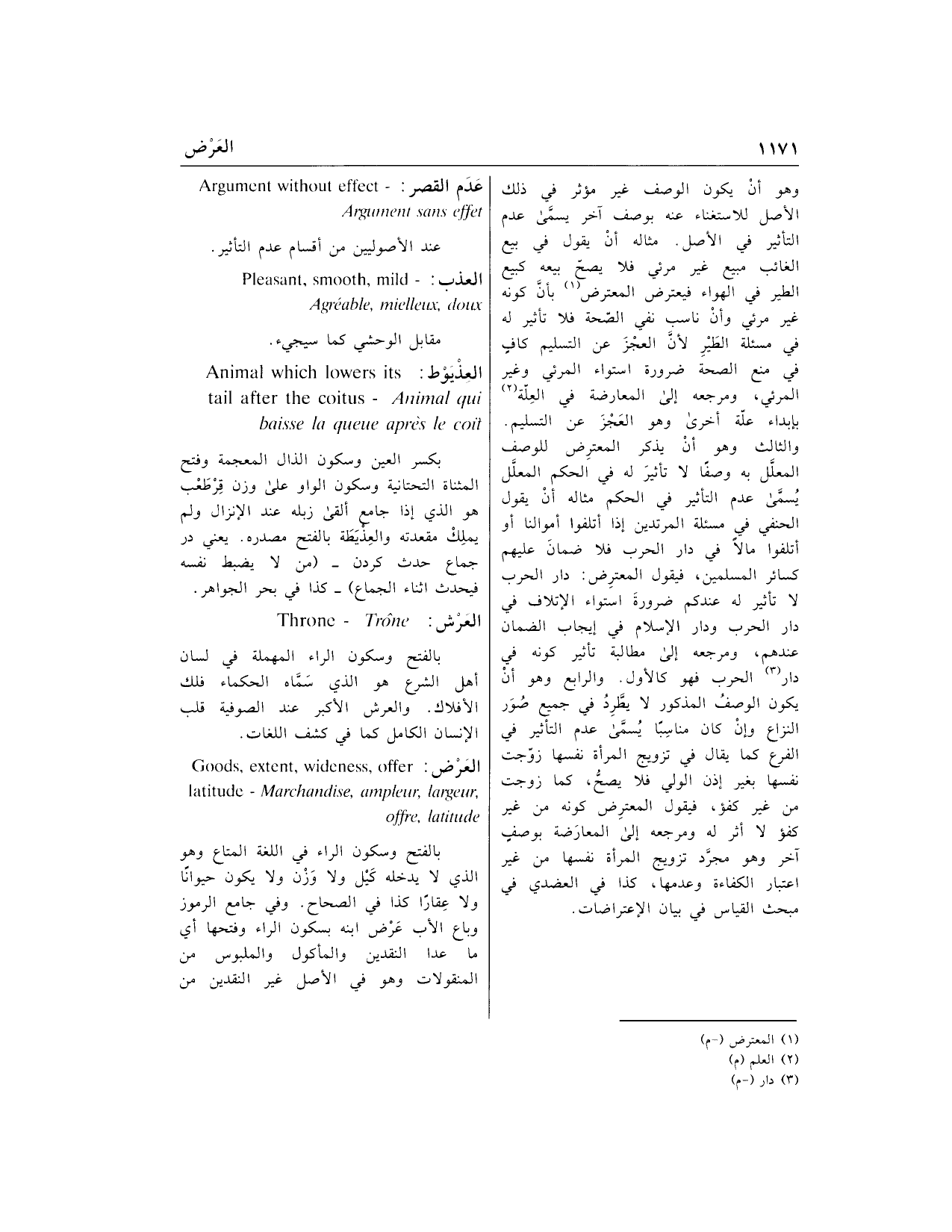 والثالث وهو أن يذكر المعترض للوصف المعلّل به وصفا لا تأثير له في الحكم المعلّل يسمّى عدم التأثير في الحكم مثاله أن يقول الحنفي في مسئلة المرتدين إذا أتلفوا أموالنا أو أتلفوا مالا في دار الحرب فلا ضمان عليهم كسائر المسلمين، فيقول المعترض: دار الحرب لا تأثير له عندكم ضرورة استواء الإتلاف في دار الحرب ودار الإسلام في إيجاب الضمان عندهم، ومرجعه إلى مطالبة تأثير كونه في دار «3» الحرب فهو كالأول. والرابع وهو أن يكون الوصف المذكور لا يطّرد في جميع صور النزاع وإن كان مناسبا يسمّى عدم التأثير في الفرع كما يقال في تزويج المرأة نفسها زوّجت نفسها بغير إذن الولي فلا يصحّ، كما زوجت من غير كفؤ، فيقول المعترض كونه من غير كفؤ لا أثر له ومرجعه إلى المعارضة بوصف آخر وهو مجرّد تزويج المرأة نفسها من غير اعتبار الكفاءة وعدمها، كذا في العضدي في مبحث القياس في بيان الاعتراضات.