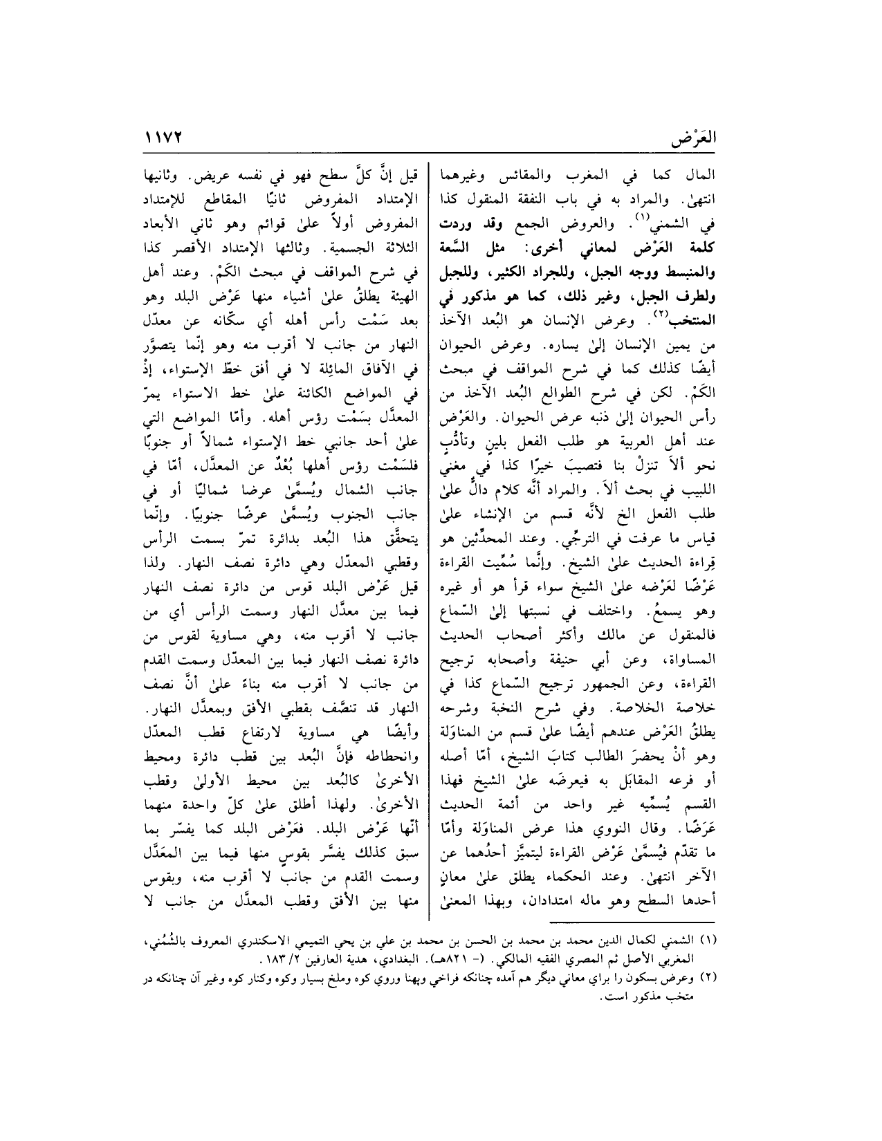 المال كما في المغرب والمقاييس وغيرهما انتهى. والمراد به في باب النفقة المنقول كذا في الشمني «1». والعروض الجمع وقد وردت كلمة العرض لمعاني أخرى: مثل السّعة والمنبسط ووجه الجبل، وللجراد الكثير، وللجبل ولطرف الجبل، وغير ذلك، كما هو مذكور في المنتخب «2». وعرض الإنسان هو البعد الآخذ من يمين الإنسان إلى يساره. وعرض الحيوان أيضا كذلك كما في شرح المواقف في مبحث الكم. لكن في شرح الطوالع البعد الآخذ من رأس الحيوان إلى ذنبه عرض الحيوان. والعرض عند أهل العربية هو طلب الفعل بلين وتأدّب نحو ألا تنزل بنا فتصيب خيرا كذا في مغني اللبيب في بحث ألا. والمراد أنّه كلام دالّ على طلب الفعل الخ لأنّه قسم من الإنشاء على قياس ما عرفت في الترجّي. وعند المحدّثين هو قراءة الحديث على الشيخ. وإنّما سمّيت القراءة عرضا لعرضه على الشيخ سواء قرأ هو أو غيره وهو يسمع. واختلف في نسبتها إلى السّماع فالمنقول عن مالك وأكثر أصحاب الحديث المساواة، وعن أبي حنيفة وأصحابه ترجيح القراءة، وعن الجمهور ترجيح السّماع كذا في خلاصة الخلاصة. وفي شرح النخبة وشرحه يطلق العرض عندهم أيضا على قسم من المناولة وهو أن يحضر الطالب كتاب الشيخ، أمّا أصله أو فرعه المقابل به فيعرضه على الشيخ فهذا القسم يسمّيه غير واحد من أئمة الحديث عرضا. وقال النووي هذا عرض المناولة وأمّا ما تقدّم فيسمّى عرض القراءة ليتميّز أحدهما عن الآخر انتهى. وعند الحكماء يطلق على معان أحدها السطح وهو ماله امتدادان، وبهذا المعنى قيل إنّ كلّ سطح فهو في نفسه عريض. وثانيها الامتداد المفروض ثانيا المقاطع للامتداد المفروض أولا على قوائم وهو ثاني الأبعاد الثلاثة الجسمية. وثالثها الامتداد الأقصر كذا في شرح المواقف في مبحث الكم. وعند أهل الهيئة يطلق على أشياء منها عرض البلد وهو بعد سمت رأس أهله أي سكّانه عن معدّل النهار من جانب لا أقرب منه وهو إنّما يتصوّر في الآفاق المائلة لا في أفق خطّ الإستواء، إذ في المواضع الكائنة على خط الاستواء يمرّ المعدّل بسمت رءوس أهله. وأمّا المواضع التي على أحد جانبي خط الإستواء شمالا أو جنوبا فلسمت رءوس أهلها بعد عن المعدّل، أمّا في جانب الشمال ويسمّى عرضا شماليا أو في جانب الجنوب ويسمّى عرضا جنوبيا. وإنّما يتحقّق هذا البعد بدائرة تمرّ بسمت الرأس وقطبي المعدّل وهي دائرة نصف النهار. ولذا قيل عرض البلد قوس من دائرة نصف النهار فيما بين معدّل النهار وسمت الرأس أي من جانب لا أقرب منه، وهي مساوية لقوس من دائرة نصف النهار فيما بين المعدّل وسمت القدم من جانب لا أقرب منه بناء على أنّ نصف النهار قد تنصّف بقطبي الأفق وبمعدّل النهار.