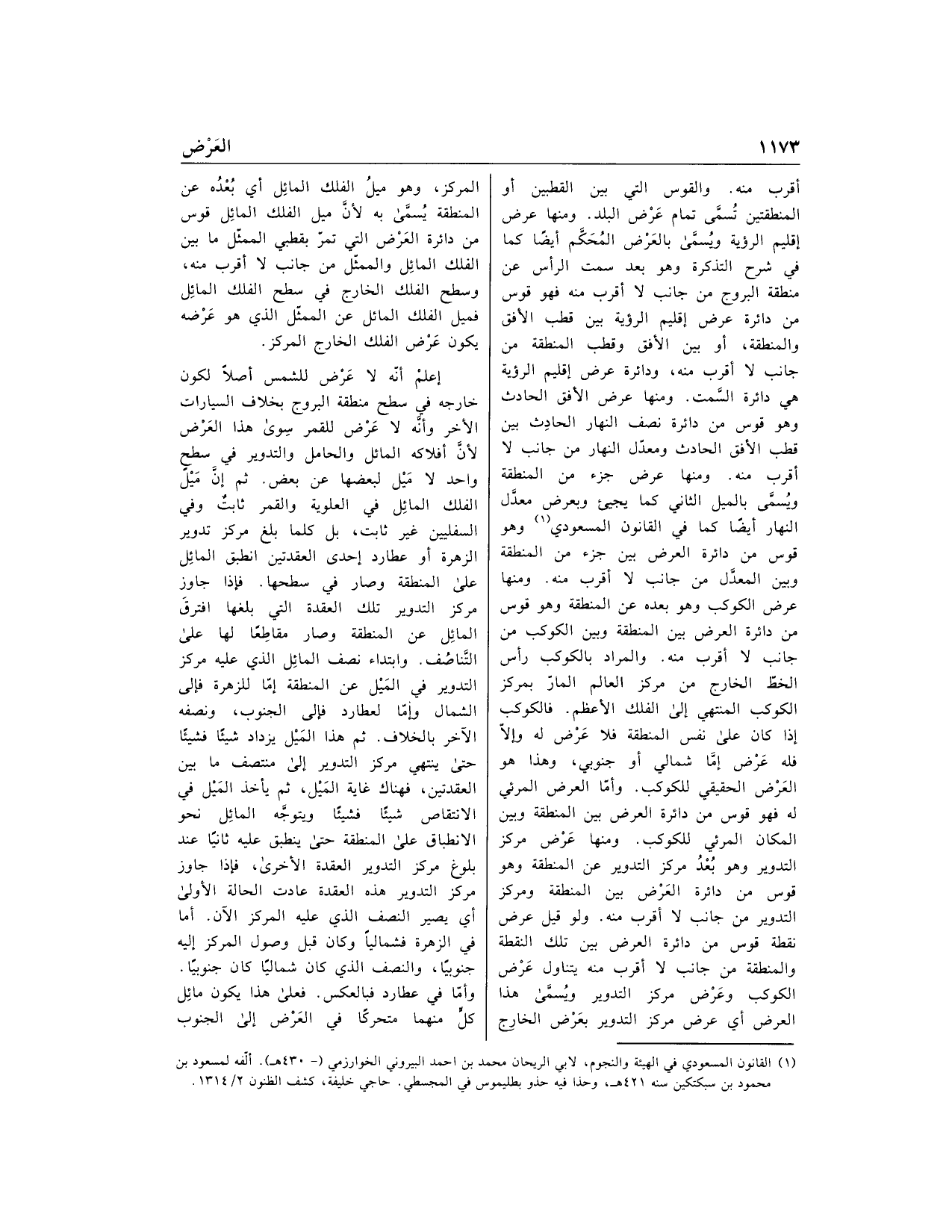 أقرب منه. والقوس التي بين القطبين أو المنطقتين تسمّى تمام عرض البلد. ومنها عرض إقليم الرؤية ويسمّى بالعرض المحكّم أيضا كما في شرح التذكرة وهو بعد سمت الرأس عن منطقة البروج من جانب لا أقرب منه فهو قوس من دائرة عرض إقليم الرؤية بين قطب الأفق والمنطقة، أو بين الأفق وقطب المنطقة من جانب لا أقرب منه، ودائرة عرض إقليم الرؤية هي دائرة السّمت. ومنها عرض الأفق الحادث وهو قوس من دائرة نصف النهار الحادث بين قطب الأفق الحادث ومعدّل النهار من جانب لا أقرب منه. ومنها عرض جزء من المنطقة ويسمّى بالميل الثاني كما يجيء وبعرض معدّل النهار أيضا كما في القانون المسعودي «1» وهو قوس من دائرة العرض بين جزء من المنطقة وبين المعدّل من جانب لا أقرب منه. ومنها عرض الكوكب وهو بعده عن المنطقة وهو قوس من دائرة العرض بين المنطقة وبين الكوكب من جانب لا أقرب منه. والمراد بالكوكب رأس الخطّ الخارج من مركز العالم المارّ بمركز الكوكب المنتهي إلى الفلك الأعظم. فالكوكب إذا كان على نفس المنطقة فلا عرض له وإلّا فله عرض إمّا شمالي أو جنوبي، وهذا هو العرض الحقيقي للكوكب. وأمّا العرض المرئي له فهو قوس من دائرة العرض بين المنطقة وبين المكان المرئي للكوكب. ومنها عرض مركز التدوير وهو بعد مركز التدوير عن المنطقة وهو قوس من دائرة العرض بين المنطقة ومركز التدوير من جانب لا أقرب منه. ولو قيل عرض نقطة قوس من دائرة العرض بين تلك النقطة والمنطقة من جانب لا أقرب منه يتناول عرض الكوكب وعرض مركز التدوير ويسمّى هذا العرض أي عرض مركز التدوير بعرض الخارج المركز، وهو ميل الفلك المائل أي بعده عن المنطقة يسمّى به لأنّ ميل الفلك المائل قوس من دائرة العرض التي تمرّ بقطبي الممثّل ما بين الفلك المائل والممثّل من جانب لا أقرب منه، وسطح الفلك الخارج في سطح الفلك المائل فميل الفلك المائل عن الممثّل الذي هو عرضه يكون عرض الفلك الخارج المركز.