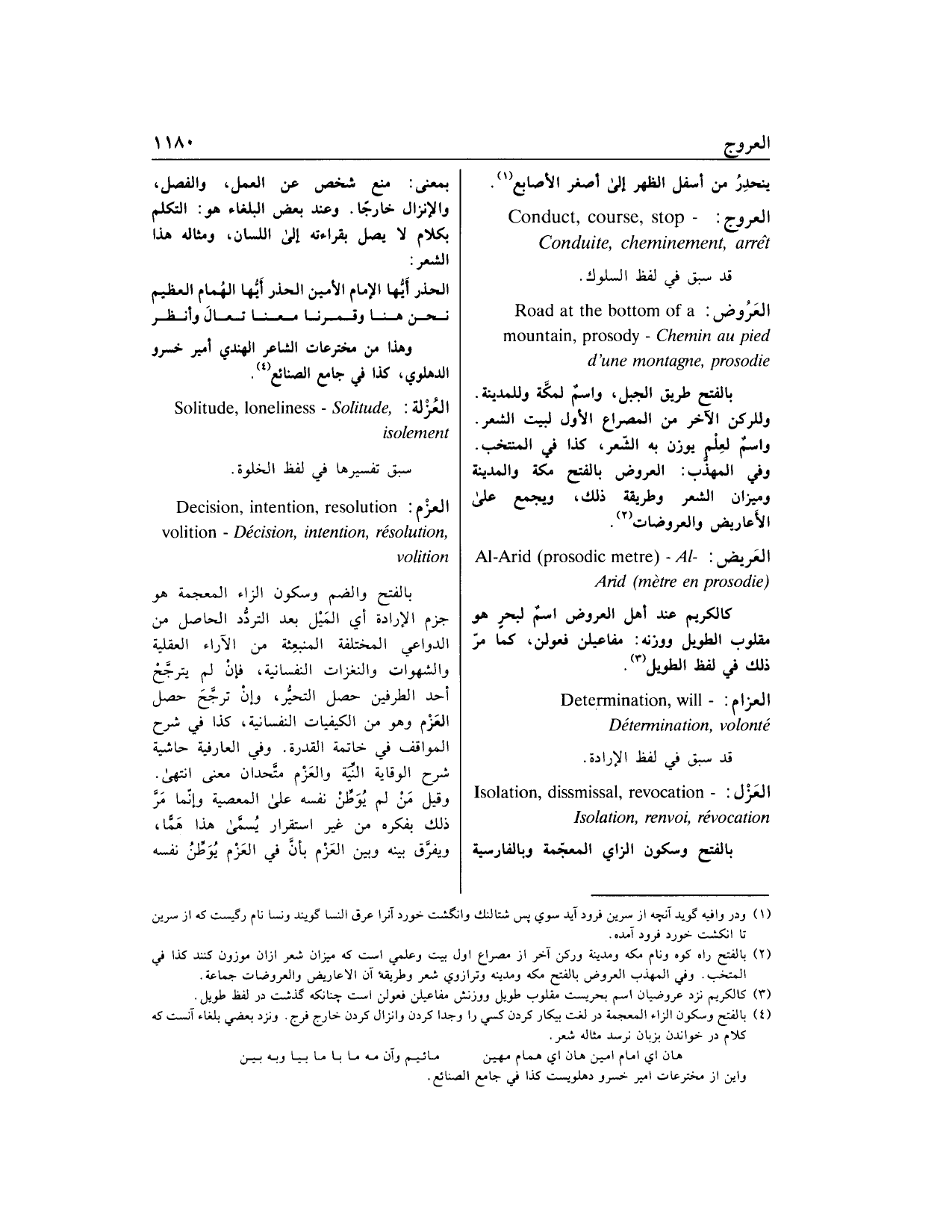 (2) بالفتح راه كوه ونام مكه ومدينة وركن آخر از مصراع اوّل بيت وعلمي است كه ميزان شعر از ان موزون كنند كذا في المنتخب. وفي المهذب العروض بالفتح مكه ومدينه وترازوي شعر وطريقه آن الاعاريض والعروضات جماعة.