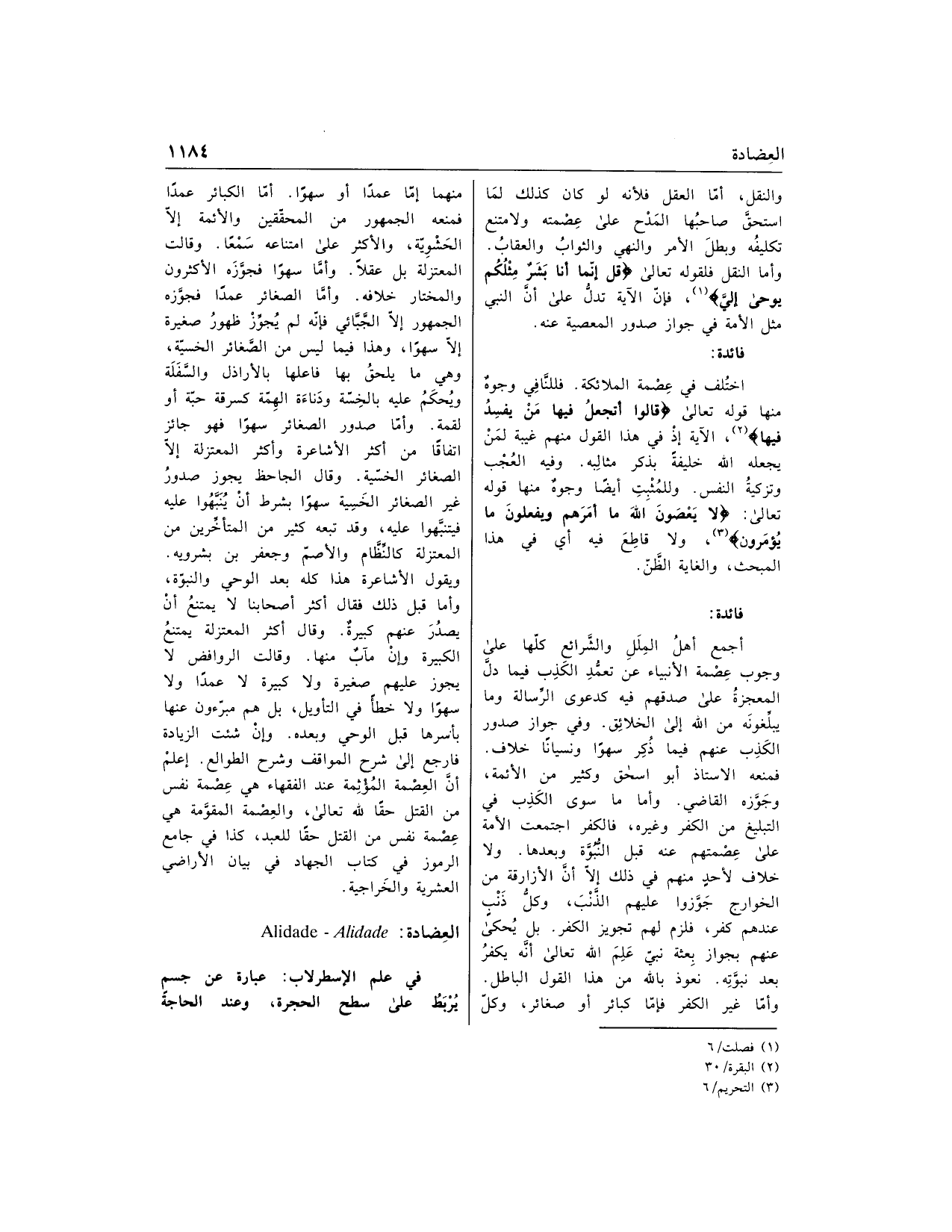 ويقول الأشاعرة هذا كله بعد الوحي والنبوّة، وأما قبل ذلك فقال أكثر أصحابنا لا يمتنع أن يصدر عنهم كبيرة. وقال أكثر المعتزلة يمتنع الكبيرة وإن مآب منها. وقالت الروافض لا يجوز عليهم صغيرة ولا كبيرة لا عمدا ولا سهوا ولا خطأ في التأويل، بل هم مبرّءون عنها بأسرها قبل الوحي وبعده. وإن شئت الزيادة فارجع إلى شرح المواقف وشرح الطوالع. اعلم أنّ العصمة المؤثمة عند الفقهاء هي عصمة نفس من القتل حقا لله تعالى، والعصمة المقوّمة هي عصمة نفس من القتل حقا للعبد، كذا في جامع الرموز في كتاب الجهاد في بيان الأراضي العشرية والخراجية.