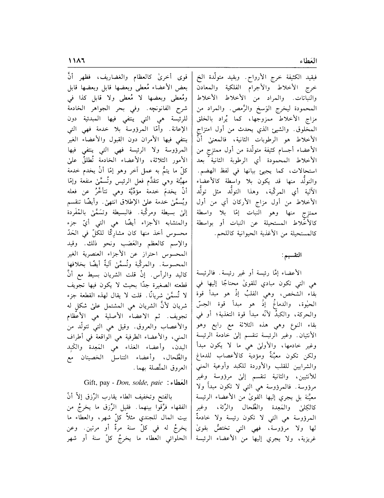 الأعضاء إمّا رئيسة أو غير رئيسة. فالرئيسة هي التي تكون مبادي للقوى محتاجا إليها في بقاء الشخص، وهي القلب إذ هو مبدأ قوة الحياة، والدماغ إذ هو مبدأ قوة الحسّ والحركة، والكبد لأنّه مبدأ قوة التغذية؛ أو في بقاء النوع وهي هذه الثلاثة مع رابع وهو الأنثيان. وغير الرئيسة تنقسم إلى خادمة الرئيسة وغير خادمها، والأولى هي ما لا يكون مبدأ ولكن تكون معيّنة ومؤدية كالأعصاب للدماغ والشرايين للقلب والأوردة للكبد وأوعية المني للأنثيين، والثانية تنقسم إلى مرءوسة وغير مرءوسة. فالمرءوسة هي التي لا تكون مبدأ ولا معيّنة بل يجري إليها القوى من الأعضاء الرئيسة كالكلى والمعدة والطّحال والرّئة، وغير المرءوسة هي التي لا تكون رئيسة ولا خادمة لها ولا مرءوسة، فهي التي تختصّ بقوى غريزية، ولا يجري إليها من الأعضاء الرئيسة قوى أخرى كالعظام والغضاريف، فظهر أنّ بعض الأعضاء معطى وبعضها قابل وبعضها قابل ومعطى وبعضها لا معطى ولا قابل كذا في شرح القانونچهـ. وفي بحر الجواهر الخادمة للرئيسة هي التي ينتفي فيها المبدئية دون الإعانة. وأمّا المرءوسة بلا خدمة فهي التي ينتفي فيها الأمران دون القبول والأعضاء الغير المرءوسة ولا الرئيسة فهي التي ينتفي فيها الأمور الثلاثة، والأعضاء الخادمة تطلق على كلّ ما يتمّ به عمل آخر وهو إمّا أن يخدم خدمة مهيّئة وهي تتقدّم فعل الرئيس وتسمّى منفعة وإمّا أن يخدم خدمة مؤدّية وهي تتأخّر عن فعله ويسمّى خدمة على الإطلاق انتهى. وأيضا تنقسم إلى بسيطة ومركّبة. فالبسيطة وتسمّى بالمفردة والمتشابه الأجزاء أيضا هي التي أيّ جزء محسوس أخذ منها كان مشاركا للكلّ في الحدّ والاسم كالعظم والعصب ونحو ذلك. وقيد المحسوس احتراز عن الأجزاء العنصرية الغير المحسوسة. والمركّبة وتسمّى آلية أيضا بخلافها كاليد والرأس. إن قلت الشريان بسيط مع أنّ قطعته الصغيرة جدا بحيث لا يكون فيها تجويف لا تسمّى شريانا. قلت لا يقال لهذه القطعة جزء شريان لأنّ الشريان هي المشتمل على شكل له تجويف. ثم الاعضاء الأصلية هي الأعظام والأعصاب والعروق. وقيل هي التي تتولّد من المني، والأعضاء الطرفية هي الواقعة في أطراف البدن، وأعضاء الغذاء هي المعدة والكبد والطّحال، وأعضاء التناسل الخصيتان مع العروق المتّصلة بهما.