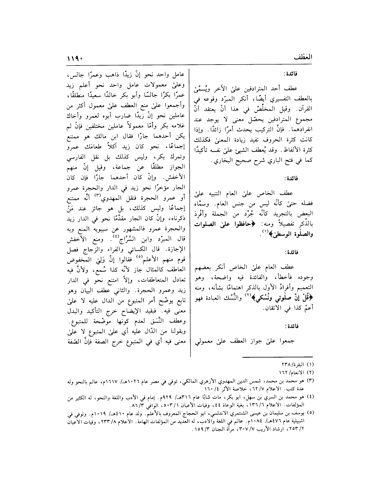 عطف الخاص على العام التنبيه على فضله حتى كأنّه ليس من جنس العام. وسمّاه البعض بالتجريد كأنّه جرّد من الجملة وأفرد بالذّكر تفصيلا ومنه: حافِظُوا عَلَى الصَّلَواتِ وَالصَّلاةِ الْوُسْطى «1».