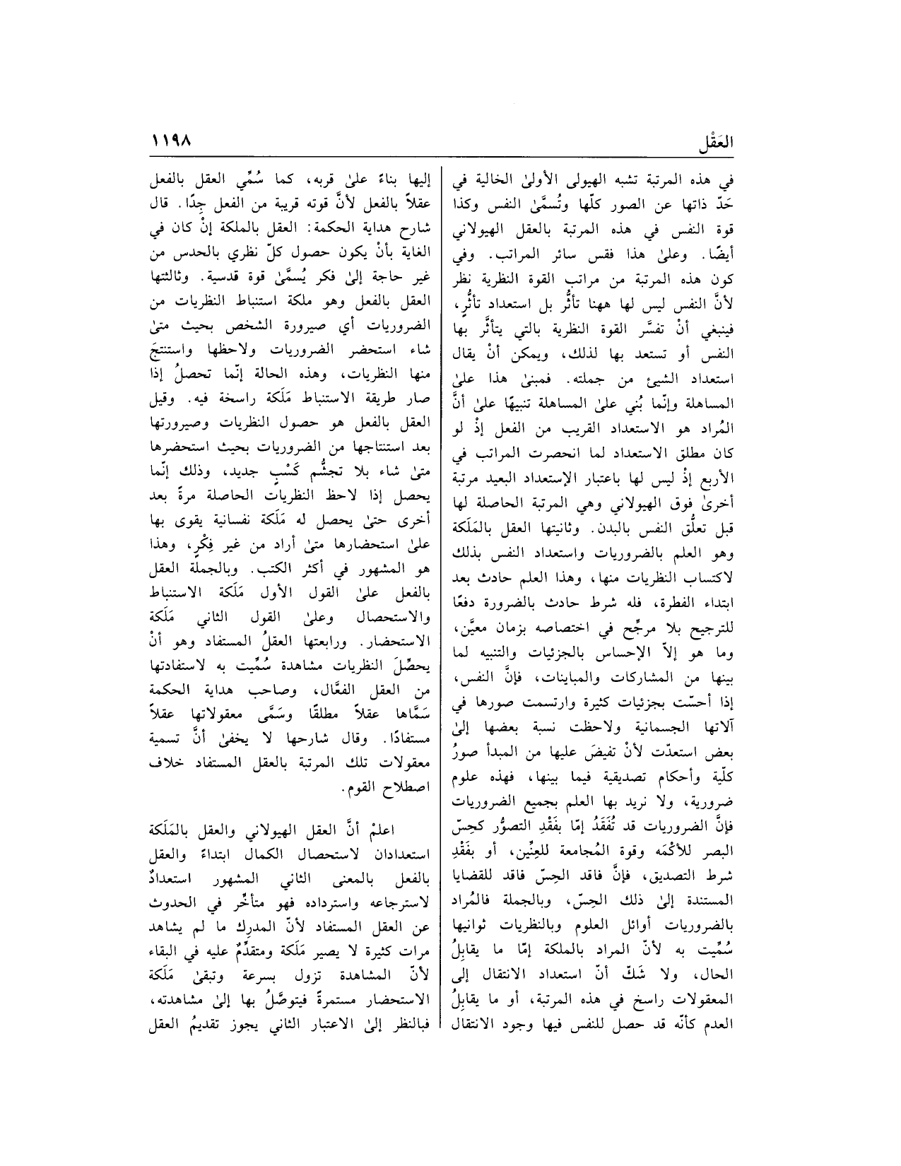 في هذه المرتبة تشبه الهيولى الأولى الخالية في حدّ ذاتها عن الصور كلّها وتسمّى النفس وكذا قوة النفس في هذه المرتبة بالعقل الهيولاني أيضا. وعلى هذا فقس سائر المراتب. وفي كون هذه المرتبة من مراتب القوة النظرية نظر لأنّ النفس ليس لها هاهنا تأثّر بل استعداد تأثّر، فينبغي أن تفسّر القوة النظرية بالتي يتأثّر بها النفس أو تستعد بها لذلك، ويمكن أن يقال استعداد الشيء من جملته. فمبنى هذا على المساهلة وإنّما بني على المساهلة تنبيها على أنّ المراد هو الاستعداد القريب من الفعل إذ لو كان مطلق الاستعداد لما انحصرت المراتب في الأربع إذ ليس لها باعتبار الاستعداد البعيد مرتبة أخرى فوق الهيولاني وهي المرتبة الحاصلة لها قبل تعلّق النفس بالبدن. وثانيتها العقل بالملكة وهو العلم بالضروريات واستعداد النفس بذلك لاكتساب النظريات منها، وهذا العلم حادث بعد ابتداء الفطرة، فله شرط حادث بالضرورة دفعا للترجيح بلا مرجّح في اختصاصه بزمان معيّن، وما هو إلّا الإحساس بالجزئيات والتنبيه لما بينها من المشاركات والمباينات، فإنّ النفس، إذا أحسّت بجزئيات كثيرة وارتسمت صورها في آلاتها الجسمانية ولاحظت نسبة بعضها إلى بعض استعدّت لأن تفيض عليها من المبدأ صور كلّية وأحكام تصديقية فيما بينها، فهذه علوم ضرورية، ولا نريد بها العلم بجميع الضروريات فإنّ الضروريات قد تفقد إمّا بفقد التصوّر كحسّ البصر للأكمه وقوة المجامعة للعنّين، أو بفقد شرط التصديق، فإنّ فاقد الحسّ فاقد للقضايا المستندة إلى ذلك الحسّ، وبالجملة فالمراد بالضروريات أوائل العلوم وبالنظريات ثوانيها سمّيت به لأنّ المراد بالملكة إمّا ما يقابل الحال، ولا شكّ أنّ استعداد الانتقال إلى المعقولات راسخ في هذه المرتبة، أو ما يقابل العدم كأنّه قد حصل للنفس فيها وجود الانتقال إليها بناء على قربه، كما سمّي العقل بالفعل عقلا بالفعل لأنّ قوته قريبة من الفعل جدا. قال شارح هداية الحكمة: العقل بالملكة إن كان في الغاية بأن يكون حصول كلّ نظري بالحدس من غير حاجة إلى فكر يسمّى قوة قدسية. وثالثتها العقل بالفعل وهو ملكة استنباط النظريات من الضروريات أي صيرورة الشخص بحيث متى شاء استحضر الضروريات ولا حظها واستنتج منها النظريات، وهذه الحالة إنّما تحصل إذا صار طريقة الاستنباط ملكة راسخة فيه. وقيل العقل بالفعل هو حصول النظريات وصيرورتها بعد استنتاجها من الضروريات بحيث استحضرها متى شاء بلا تجشّم كسب جديد، وذلك إنّما يحصل إذا لاحظ النظريات الحاصلة مرة بعد أخرى حتى يحصل له ملكة نفسانية يقوى بها على استحضارها متى أراد من غير فكر، وهذا هو المشهور في أكثر الكتب. وبالجملة العقل بالفعل على القول الأول ملكة الاستنباط والاستحصال وعلى القول الثاني ملكة الاستحضار. ورابعتها العقل المستفاد وهو أن يحصّل النظريات مشاهدة سمّيت به لاستفادتها من العقل الفعّال، وصاحب هداية الحكمة سمّاها عقلا مطلقا وسمّى معقولاتها عقلا مستفادا. وقال شارحها لا يخفى أنّ تسمية معقولات تلك المرتبة بالعقل المستفاد خلاف اصطلاح القوم.