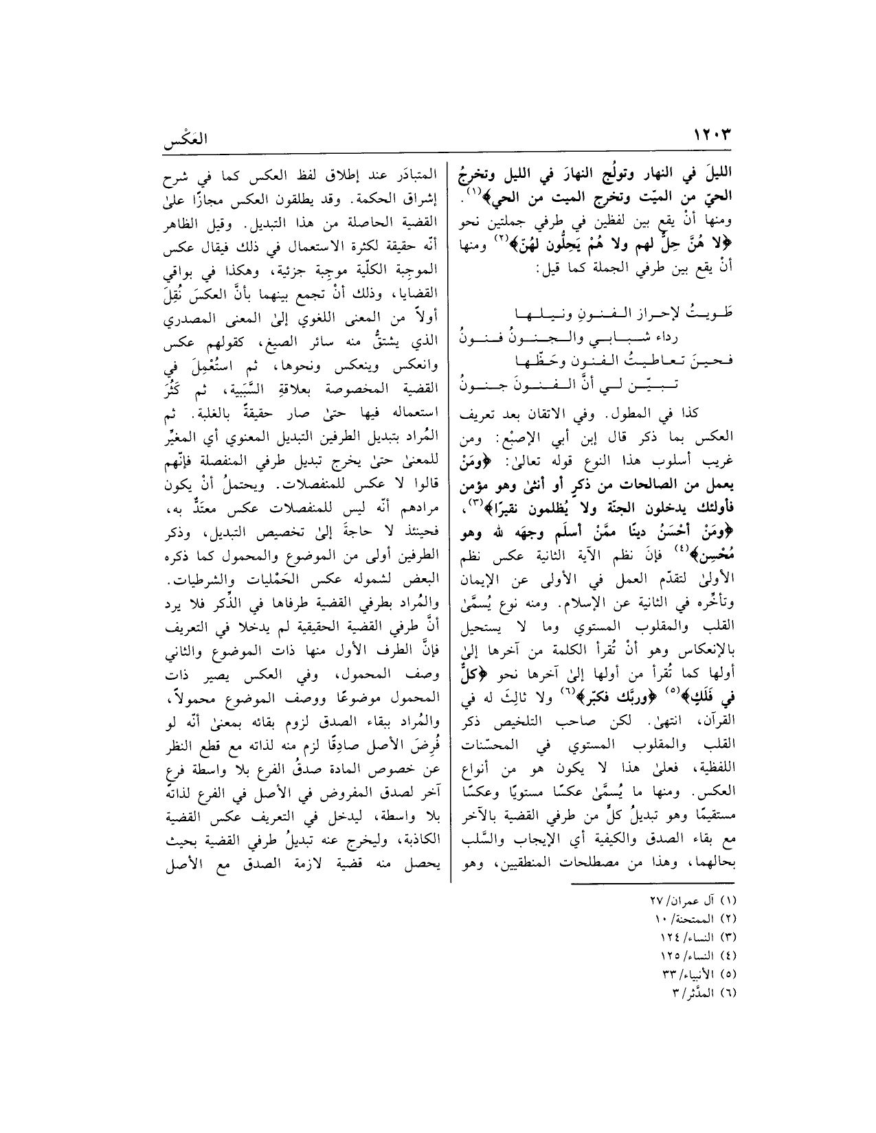 طويت لإحراز الفنون ونيلها رداء شبابي والجنون فنون فحين تعاطيت الفنون وحظّها تبيّن لي أنّ الفنون جنون كذا في المطول. وفي الاتقان بعد تعريف العكس بما ذكر قال ابن أبي الإصبع: ومن غريب أسلوب هذا النوع قوله تعالى: وَمَنْ يَعْمَلْ مِنَ الصَّالِحاتِ مِنْ ذَكَرٍ أَوْ أُنْثى وَهُوَ مُؤْمِنٌ فَأُولئِكَ يَدْخُلُونَ الْجَنَّةَ وَلا يُظْلَمُونَ نَقِيراً «3»، وَمَنْ أَحْسَنُ دِيناً مِمَّنْ أَسْلَمَ وَجْهَهُ لِلَّهِ وَهُوَ مُحْسِنٌ «4» فإن نظم الآية الثانية عكس نظم الأولى لتقدّم العمل في الأولى عن الإيمان وتأخّره في الثانية عن الإسلام. ومنه نوع يسمّى القلب والمقلوب المستوي وما لا يستحيل بالانعكاس وهو أن تقرأ الكلمة من آخرها إلى أولها كما تقرأ من أولها إلى آخرها نحو كُلٌّ فِي فَلَكٍ «5» وَرَبَّكَ فَكَبِّرْ «6» ولا ثالث له في القرآن، انتهى. لكن صاحب التلخيص ذكر القلب والمقلوب المستوي في المحسّنات اللفظية، فعلى هذا لا يكون هو من أنواع العكس. ومنها ما يسمّى عكسا مستويا وعكسا مستقيما وهو تبديل كلّ من طرفي القضية بالآخر مع بقاء الصدق والكيفية أي الإيجاب والسّلب بحالهما، وهذا من مصطلحات المنطقيين، وهو المتبادر عند إطلاق لفظ العكس كما في شرح إشراق الحكمة. وقد يطلقون العكس مجازا على القضية الحاصلة من هذا التبديل. وقيل الظاهر أنّه حقيقة لكثرة الاستعمال في ذلك فيقال عكس الموجبة الكلّية موجبة جزئية، وهكذا في بواقي القضايا، وذلك أن تجمع بينهما بأنّ العكس نقل أولا من المعنى اللغوي إلى المعنى المصدري الذي يشتقّ منه سائر الصيغ، كقولهم عكس وانعكس وينعكس ونحوها، ثم استعمل في القضية المخصوصة بعلاقة السّببية، ثم كثر استعماله فيها حتى صار حقيقة بالغلبة. ثم المراد بتبديل الطرفين التبديل المعنوي أي المغيّر للمعنى حتى يخرج تبديل طرفي المنفصلة فإنّهم قالوا لا عكس للمنفصلات. ويحتمل أن يكون مرادهم أنّه ليس للمنفصلات عكس معتدّ به، فحينئذ لا حاجة إلى تخصيص التبديل، وذكر الطرفين أولى من الموضوع والمحمول كما ذكره البعض لشموله عكس الحمليات والشرطيات.
