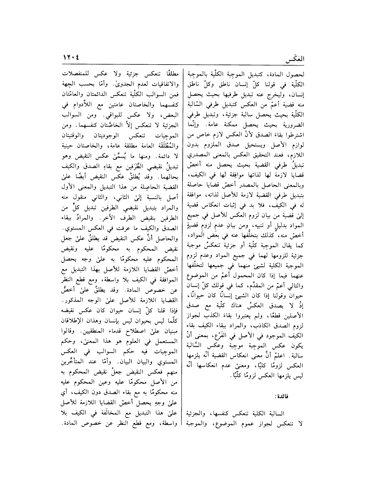 لحصول المادة، كتبديل الموجبة الكلّية بالموجبة الكلّية في قولنا كلّ إنسان ناطق وكلّ ناطق إنسان، وليخرج عنه تبديل طرفيها بحيث يحصل منه قضية أعمّ من العكس كتبديل طرفي السّالبة الكلّية بحيث يحصل سالبة جزئية، وتبديل طرفي الضرورية بحيث يحصل ممكنة عامة. وإنّما اشترطوا بقاء الصدق لأنّ العكس لازم خاص من لوازم الأصل ويستحيل صدق الملزوم بدون اللازم، فعند التحقيق العكس بالمعنى المصدري تبديل طرفي القضية بحيث يحصل منه أخصّ قضايا لازمة لها لذاتها موافقة لها في الكيف، وبالمعنى الحاصل بالمصدر أخصّ قضايا حاصلة بتبديل طرفي القضية لازمة للأصل لذاته، موافقة له في الكيف، فلا بد في إثبات انعكاس قضية إلى قضية من بيان لزوم العكس للأصل في جميع المواد بدليل أو تنبيه، ومن بيان عدم لزوم قضية أخصّ منه، كذلك بتخلّفها عنه في بعض المواد، كما يقال الموجبة كلّية أو جزئية تنعكس موجبة جزئية للزومها لهما في جميع المواد وعدم لزوم الموجبة الكلية لشيء منهما في جميعها لتخلّفها عنهما فيما إذا كان المحمول أعمّ من الموضوع والتالي أعمّ من المقدّم، كما في قولك كلّ إنسان حيوان وقولنا إذا كان الشيء إنسانا كان حيوانا، إذ لا يصدق العكس هناك كلّية مع صدق الأصلين قطعا، ولم يعتبروا بقاء الكذب لجواز لزوم الصدق الكاذب، والمراد ببقاء الكيف بقاء الكيف الموجود في الأصل في الفرع، بمعنى أن يكون عكس الموجبة موجبة وعكس السّالبة سالبة. اعلم أنّ معنى انعكاس القضية أنّه يلزمها العكس لزوما كليا، ومعنى عدم انعكاسها أنّه ليس يلزمها العكس لزوما كلّيا.