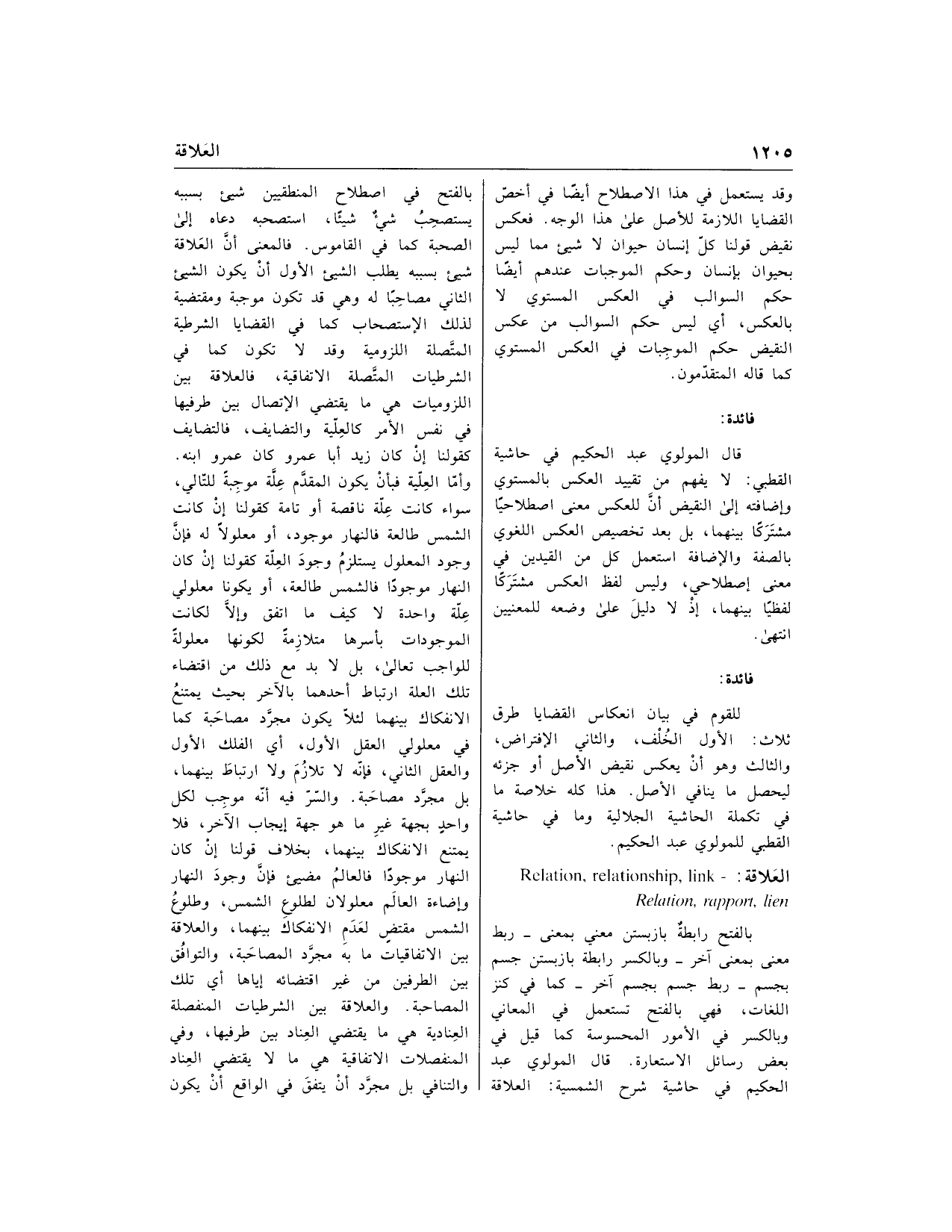 بالفتح رابطة بازبستن معنى بمعنى- ربط معنى بمعنى آخر- وبالكسر رابطة بازبستن جسم بجسم- ربط جسم بجسم آخر- كما في كنز اللغات، فهي بالفتح تستعمل في المعاني وبالكسر في الأمور المحسوسة كما قيل في بعض رسائل الاستعارة. قال المولوي عبد الحكيم في حاشية شرح الشمسية: العلاقة بالفتح في اصطلاح المنطقيين شيء بسببه يستصحب شيء شيئا، استصحبه دعاه إلى الصحبة كما في القاموس. فالمعنى أنّ العلاقة شيء بسببه يطلب الشيء الأول أن يكون الشيء الثاني مصاحبا له وهي قد تكون موجبة ومقتضية لذلك الاستصحاب كما في القضايا الشرطية المتّصلة اللزومية وقد لا تكون كما في الشرطيات المتّصلة الاتفاقية، فالعلاقة بين اللزوميات هي ما يقتضي الاتصال بين طرفيها في نفس الأمر كالعلّية والتضايف، فالتضايف كقولنا إن كان زيد أبا عمرو كان عمرو ابنه.
