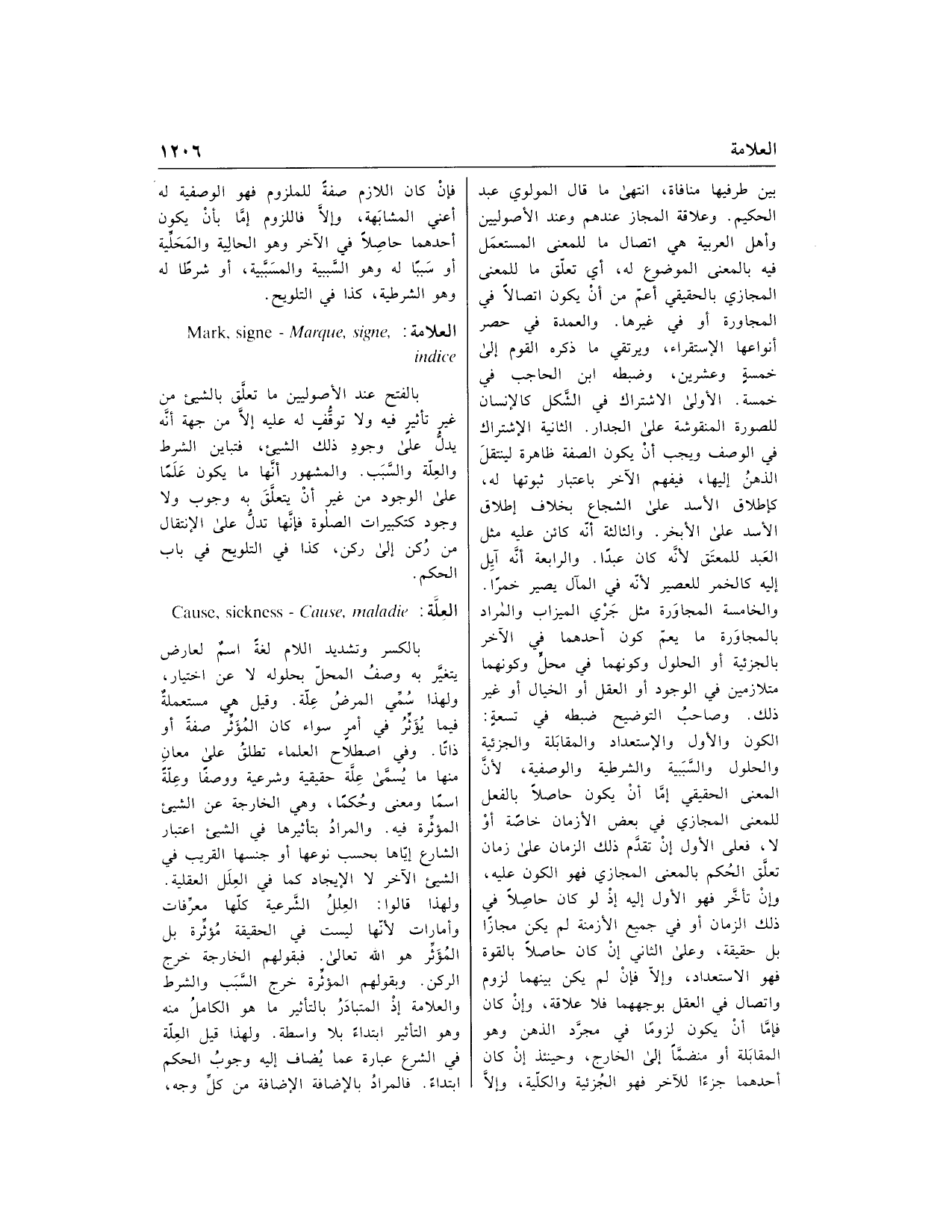 بالفتح عند الأصوليين ما تعلّق بالشيء من غير تأثير فيه ولا توقّف له عليه إلّا من جهة أنّه يدلّ على وجود ذلك الشيء، فتباين الشرط والعلّة والسّبب. والمشهور أنّها ما يكون علما على الوجود من غير أن يتعلّق به وجوب ولا وجود كتكبيرات الصلاة فإنّها تدلّ على الانتقال من ركن إلى ركن، كذا في التلويح في باب الحكم.