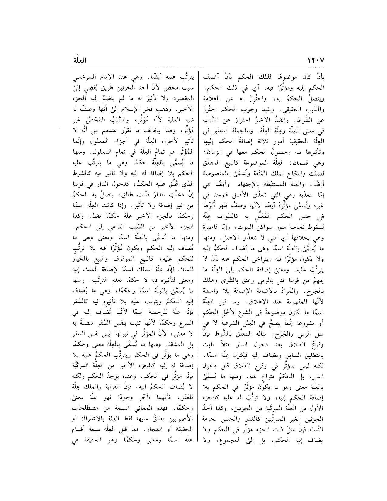 بأن كان موضوعا لذلك الحكم بأن أضيف الحكم إليه ومؤثّرا فيه، أي في ذلك الحكم، ويتصل الحكم به، واحترز به عن العلامة والسّبب الحقيقي. وبقيد وجوب الحكم احترز عن الشّرط. والقيد الأخير احتراز عن السّبب في معنى العلّة وعلّة العلّة. وبالجملة المعتبر في العلّة الحقيقية أمور ثلاثة إضافة الحكم إليها وتأثيرها فيه وحصول الحكم معها في الزمان؛ وهي قسمان: العلّة الموضوعة كالبيع المطلق للملك والنكاح لملك المتعة وتسمّى بالمنصوصة أيضا، والعلة المستنبطة بالاجتهاد. وأيضا هي إمّا متعدّية وهي التي تتعدّى الأصل فتوجد في غيره وتسمّى مؤثّرة أيضا لأنّها وصف ظهر أثرها في جنس الحكم المعلّل به كالطواف علّة لسقوط نجاسة سور سواكن البيوت، وإمّا قاصرة وهي بخلافها أي التي لا تتعدّى الأصل. ومنها ما يسمّى بالعلّة اسما وهي ما يضاف الحكم إليه ولا يكون مؤثّرا فيه ويتراخى الحكم عنه بأنّ لا يترتّب عليه. ومعنى إضافة الحكم إلى العلّة ما يفهم من قولنا قتل بالرمي وعتق بالشّرى وهلك بالجرح. والمراد بالإضافة الإضافة بلا واسطة لأنّها المفهومة عند الإطلاق. وما قيل العلّة اسما ما تكون موضوعة في الشرع لأجل الحكم أو مشروعة إنّما يصحّ في العلل الشرعية لا في مثل الرمي والجرح. مثاله المعلّق بالشّرط فإنّ وقوع الطلاق بعد دخول الدار مثلا ثابت بالتطليق السابق ومضاف إليه فيكون علّة اسما، لكنه ليس بمؤثّر في وقوع الطلاق قبل دخول الدار، بل الحكم متراخ عنه. ومنها ما يسمّى بالعلّة معنى وهو ما يكون مؤثّرا في الحكم بلا إضافة الحكم إليه، ولا ترتّب له عليه كالجزء الأول من العلّة المركّبة من الجزءين، وكذا أحد الجزءين الغير المترتّبين كالقدر والجنس لحرمة النّساء فإنّ مثل ذلك الجزء مؤثّر في الحكم ولا يضاف إليه الحكم، بل إلى المجموع، ولا يترتّب عليه أيضا. وهي عند الإمام السرخسي سبب محض لأنّ أحد الجزءين طريق يفضي إلى المقصود ولا تأثير له ما لم ينضمّ إليه الجزء الأخير. وذهب فخر الإسلام إلى أنها وصف له شبه العلية لأنّه مؤثّر، والسّبب المحض غير مؤثّر، وهذا يخالف ما تقرّر عندهم من أنّه لا تأثير لأجزاء العلّة في أجزاء المعلول وإنّما المؤثّر هو تمام العلّة في تمام المعلول. ومنها ما يسمّى بالعلّة حكما وهي ما يترتّب عليه الحكم بلا إضافة له إليه ولا تأثير فيه كالشرط الذي علّق عليه الحكم، كدخول الدار في قولنا إن دخلت الدار فأنت طالق، يتصل به الحكم من غير إضافة ولا تأثير. وإذا كانت العلّة اسما وحكما فالجزء الأخير علّة حكما فقط، وكذا الجزء الأخير من السّبب الداعي إلى الحكم.