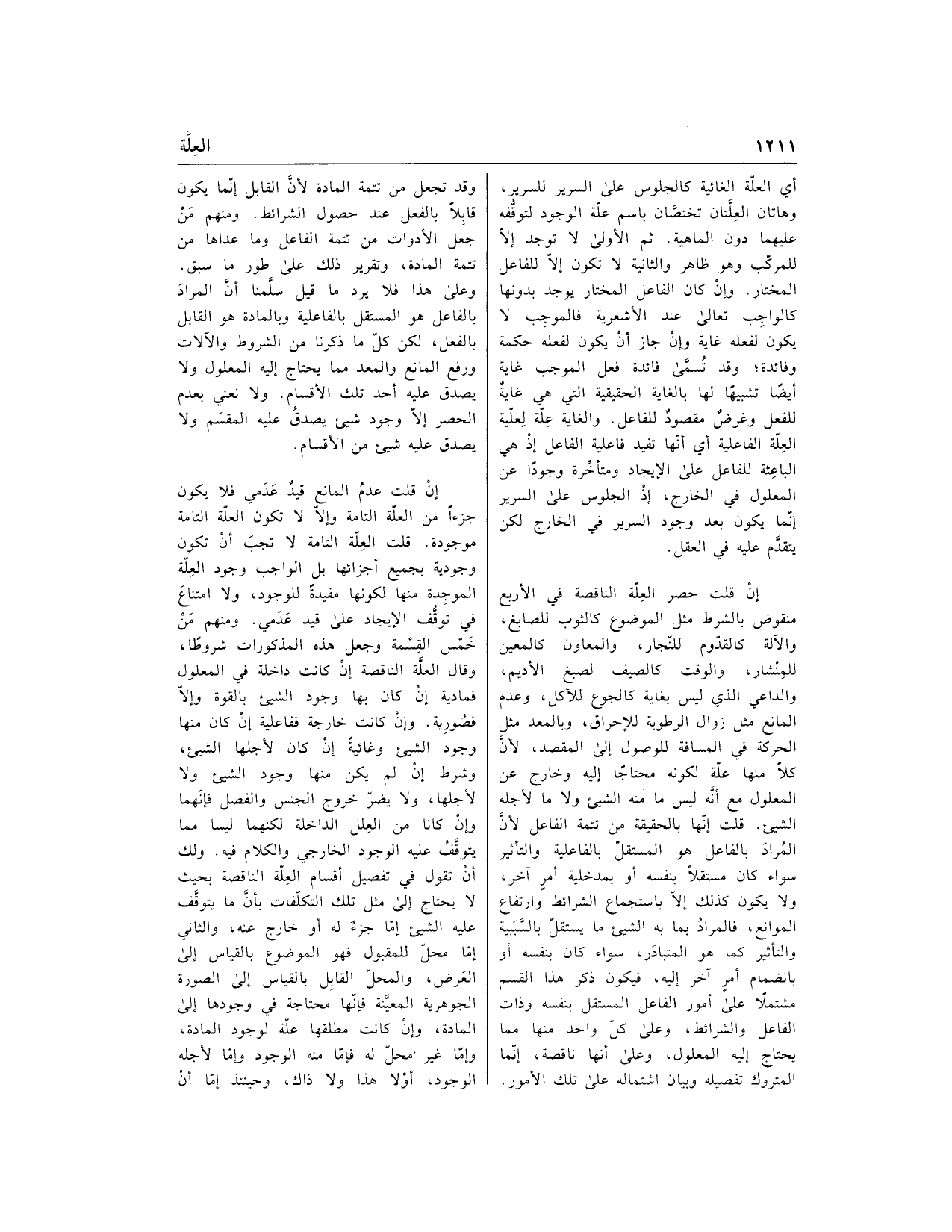إن قلت عدم المانع قيد عدمي فلا يكون جزءا من العلّة التامة وإلّا لا تكون العلّة التامة موجودة. قلت العلّة التامة لا تجب أن تكون وجودية بجميع أجزائها بل الواجب وجود العلّة الموجدة منها لكونها مفيدة للوجود، ولا امتناع في توقّف الإيجاد على قيد عدمي. ومنهم من خمّس القسمة وجعل هذه المذكورات شروطا، وقال العلّة الناقصة إن كانت داخلة في المعلول فمادية إن كان بها وجود الشيء بالقوة وإلّا فصورية. وإن كانت خارجة ففاعلية إن كان منها وجود الشيء وغائية إن كان لأجلها الشيء، وشرط إن لم يكن منها وجود الشيء ولا لأجلها، ولا يضرّ خروج الجنس والفصل فإنّهما وإن كانا من العلل الداخلة لكنهما ليسا مما يتوقّف عليه الوجود الخارجي والكلام فيه. ولك أن تقول في تفصيل أقسام العلّة الناقصة بحيث لا يحتاج إلى مثل تلك التكلّفات بأنّ ما يتوقّف عليه الشيء إمّا جزء له أو خارج عنه، والثاني إمّا محلّ للمقبول فهو الموضوع بالقياس إلى العرض، والمحلّ القابل بالقياس إلى الصورة الجوهرية المعيّنة فإنّها محتاجة في وجودها إلى المادة، وإن كانت مطلقها علّة لوجود المادة، وإمّا غير محلّ له فإمّا منه الوجود وإمّا لأجله الوجود، أولا هذا ولا ذاك، وحينئذ إمّا أن