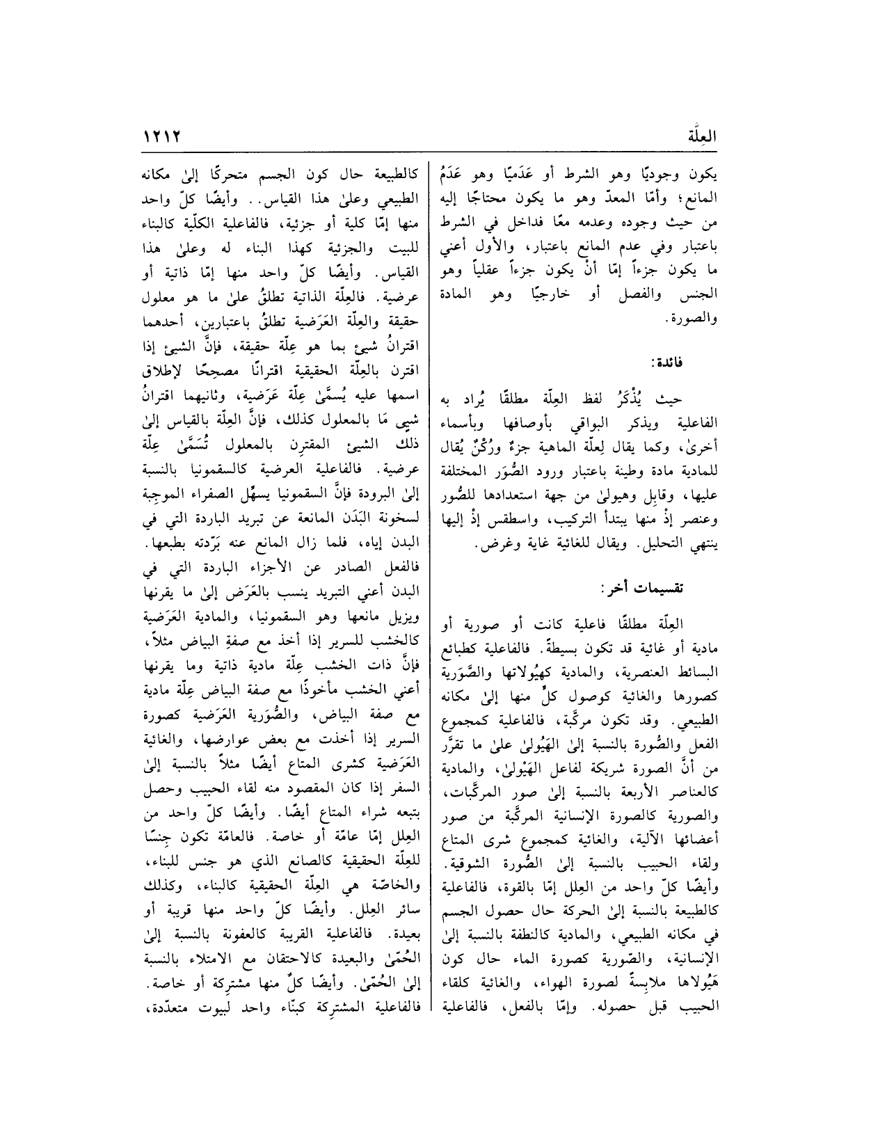 وأيضا كلّ واحد من العلل إمّا بالقوة، فالفاعلية كالطبيعة بالنسبة إلى الحركة حال حصول الجسم في مكانه الطبيعي، والمادية كالنطفة بالنسبة إلى الإنسانية، والصّورية كصورة الماء حال كون هيولاها ملابسة لصورة الهواء، والغائية كلقاء الحبيب قبل حصوله. وإمّا بالفعل، فالفاعلية كالطبيعة حال كون الجسم متحركا إلى مكانه الطبيعي وعلى هذا القياس. وأيضا كلّ واحد منها إمّا كلية أو جزئية، فالفاعلية الكلّية كالبناء للبيت والجزئية كهذا البناء له وعلى هذا القياس. وأيضا كلّ واحد منها إمّا ذاتية أو عرضية. فالعلّة الذاتية تطلق على ما هو معلول حقيقة والعلّة العرضية تطلق باعتبارين، أحدهما اقتران شيء بما هو علّة حقيقة، فإنّ الشيء إذا اقترن بالعلّة الحقيقية اقترانا مصححا لإطلاق اسمها عليه يسمّى علّة عرضية، وثانيهما اقتران شيء ما بالمعلول كذلك، فإنّ العلّة بالقياس إلى ذلك الشيء المقترن بالمعلول تسمّى علّة عرضية. فالفاعلية العرضية كالسقمونيا بالنسبة إلى البرودة فإنّ السقمونيا يسهّل الصفراء الموجبة لسخونة البدن المانعة عن تبريد الباردة التي في البدن إياه، فلما زال المانع عنه برّدته بطبعها.