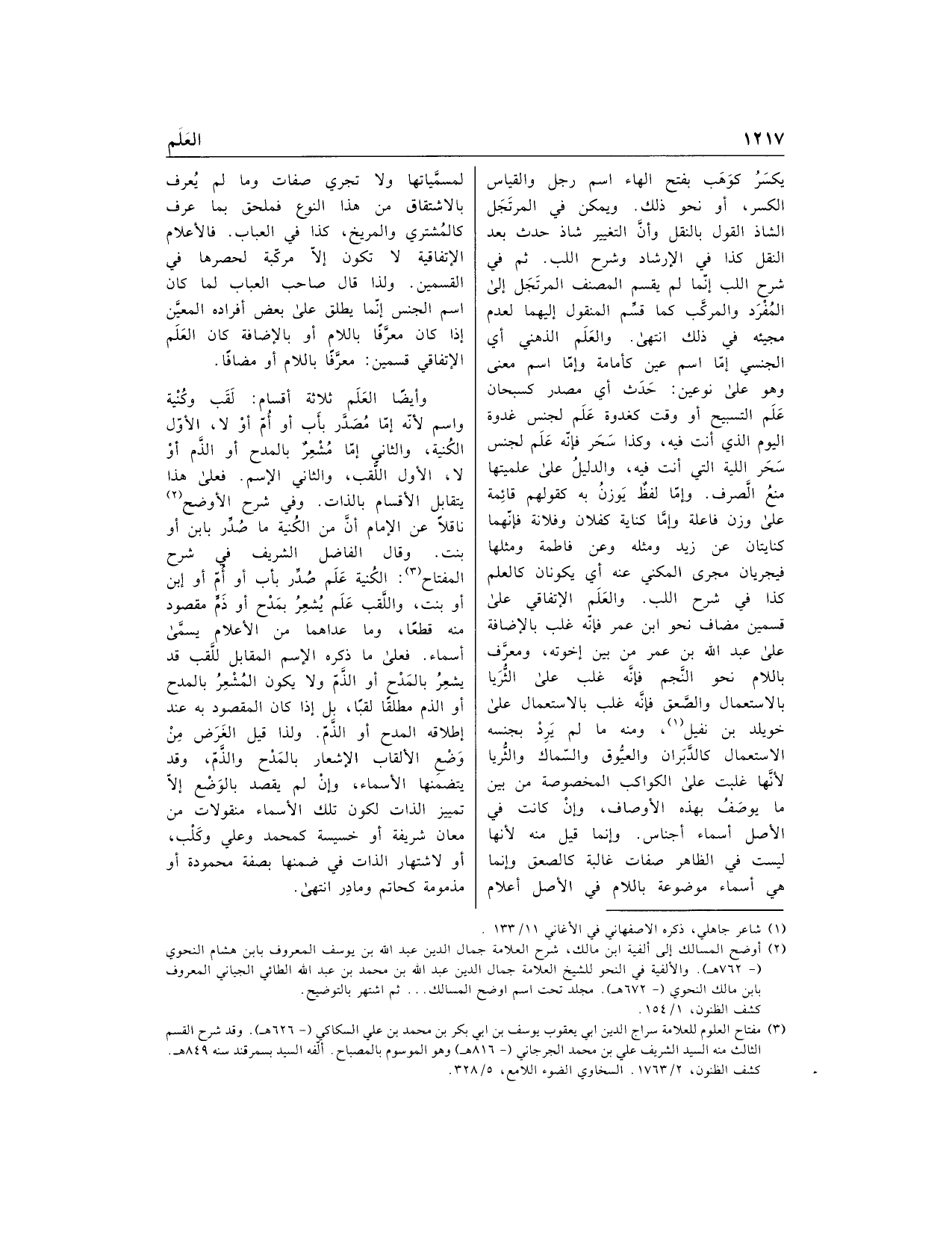 وأيضا العلم ثلاثة أقسام: لقب وكنية واسم لأنّه إمّا مصدّر بأب أو أمّ أو لا، الأوّل الكنية، والثاني إمّا مشعر بالمدح أو الذّم أو لا، الأول اللّقب، والثاني الاسم. فعلى هذا يتقابل الأقسام بالذات. وفي شرح الأوضح «2» ناقلا عن الإمام أنّ من الكنية ما صدّر بابن أو بنت. وقال الفاضل الشريف في شرح المفتاح «3»: الكنية علم صدّر بأب أو أمّ أو ابن أو بنت، واللّقب علم يشعر بمدح أو ذمّ مقصود منه قطعا، وما عداهما من الأعلام يسمّى أسماء. فعلى ما ذكره الاسم المقابل للّقب قد يشعر بالمدح أو الذّمّ ولا يكون المشعر بالمدح أو الذم مطلقا لقبا، بل إذا كان المقصود به عند إطلاقه المدح أو الذّمّ. ولذا قيل الغرض من وضع الألقاب الإشعار بالمدح والذّمّ، وقد يتضمنها الأسماء، وإن لم يقصد بالوضع إلّا تمييز الذات لكون تلك الأسماء منقولات من معان شريفة أو خسيسة كمحمد وعلي وكلب، أو لاشتهار الذات في ضمنها بصفة محمودة أو مذمومة كحاتم ومادر انتهى.
