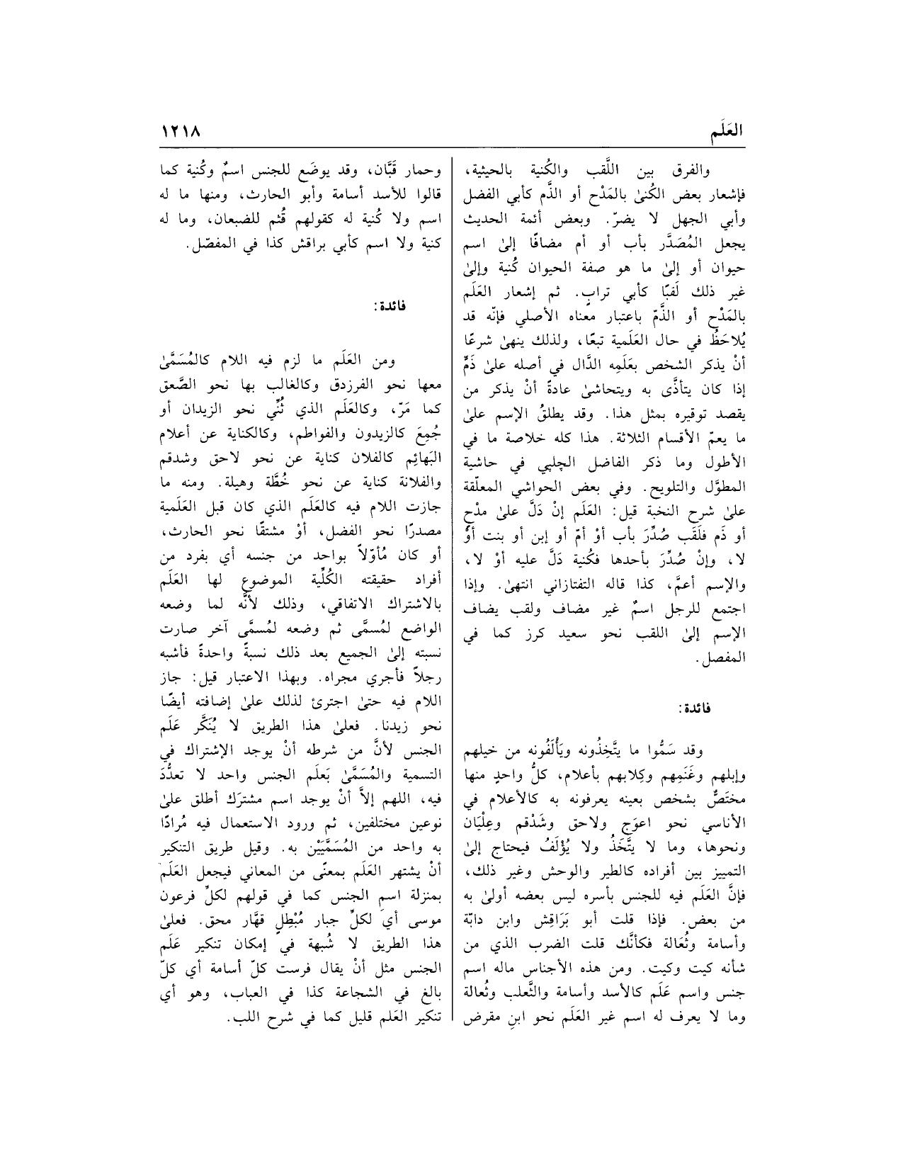 ومن العلم ما لزم فيه اللام كالمسمّى معها نحو الفرزدق وكالغالب بها نحو الصّعق كما مرّ، وكالعلم الذي ثنّي نحو الزيدان أو جمع كالزيدون والفواطم، وكالكناية عن أعلام البهائم كالفلان كناية عن نحو لاحق وشدقم والفلانة كناية عن نحو خطّة وهيلة. ومنه ما جازت اللام فيه كالعلم الذي كان قبل العلمية مصدرا نحو الفضل، أو مشتقا نحو الحارث، أو كان مؤوّلا بواحد من جنسه أي بفرد من أفراد حقيقته الكلّية الموضوع لها العلم بالاشتراك الاتفاقي، وذلك لأنّه لما وضعه الواضع لمسمّى ثم وضعه لمسمّى آخر صارت نسبته إلى الجميع بعد ذلك نسبة واحدة فأشبه رجلا فأجري مجراه. وبهذا الاعتبار قيل: جاز اللام فيه حتى اجترئ لذلك على إضافته أيضا نحو زيدنا. فعلى هذا الطريق لا ينكّر علم الجنس لأنّ من شرطه أن يوجد الاشتراك في التسمية والمسمّى بعلم الجنس واحد لا تعدّد فيه، اللهم إلّا أن يوجد اسم مشترك أطلق على نوعين مختلفين، ثم ورود الاستعمال فيه مرادا به واحد من المسمّيين به. وقيل طريق التنكير أن يشتهر العلم بمعنى من المعاني فيجعل العلم بمنزلة اسم الجنس كما في قولهم لكلّ فرعون موسى أي لكلّ جبار مبطل قهّار محق. فعلى هذا الطريق لا شبهة في إمكان تنكير علم الجنس مثل أن يقال فرست كلّ أسامة أي كلّ بالغ في الشجاعة كذا في العباب، وهو أي تنكير العلم قليل كما في شرح اللب.