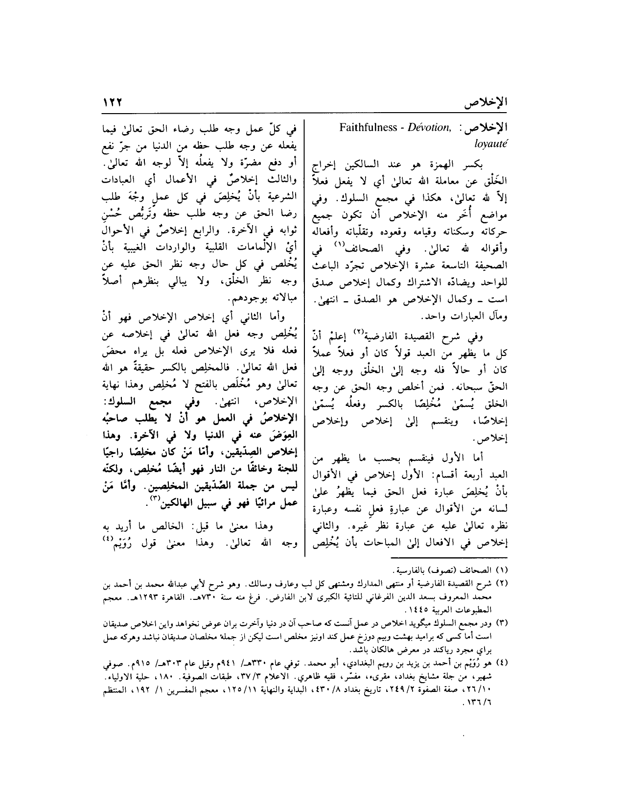 وفي شرح القصيدة الفارضية «2» اعلم أنّ كل ما يظهر من العبد قولا كان أو فعلا عملا كان أو حالا فله وجه إلى الخلق ووجه إلى الحقّ سبحانه. فمن أخلص وجه الحق عن وجه الخلق يسمّى مخلصا بالكسر وفعله يسمّى إخلاصا، وينقسم إلى إخلاص وإخلاص إخلاص.