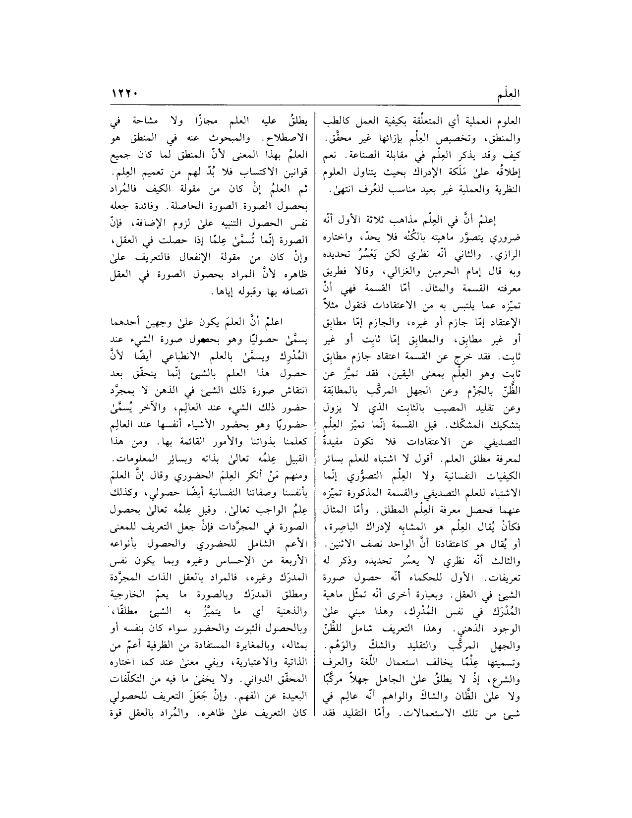 وتسميتها علما يخالف استعمال اللّغة والعرف والشرع، إذ لا يطلق على الجاهل جهلا مركّبا ولا على الظّان والشاك والواهم أنّه عالم في شيء من تلك الاستعمالات. وأمّا التقليد فقد يطلق عليه العلم مجازا ولا مشاحة في الاصطلاح. والمبحوث عنه في المنطق هو العلم بهذا المعنى لأنّ المنطق لما كان جميع قوانين الاكتساب فلا بدّ لهم من تعميم العلم.