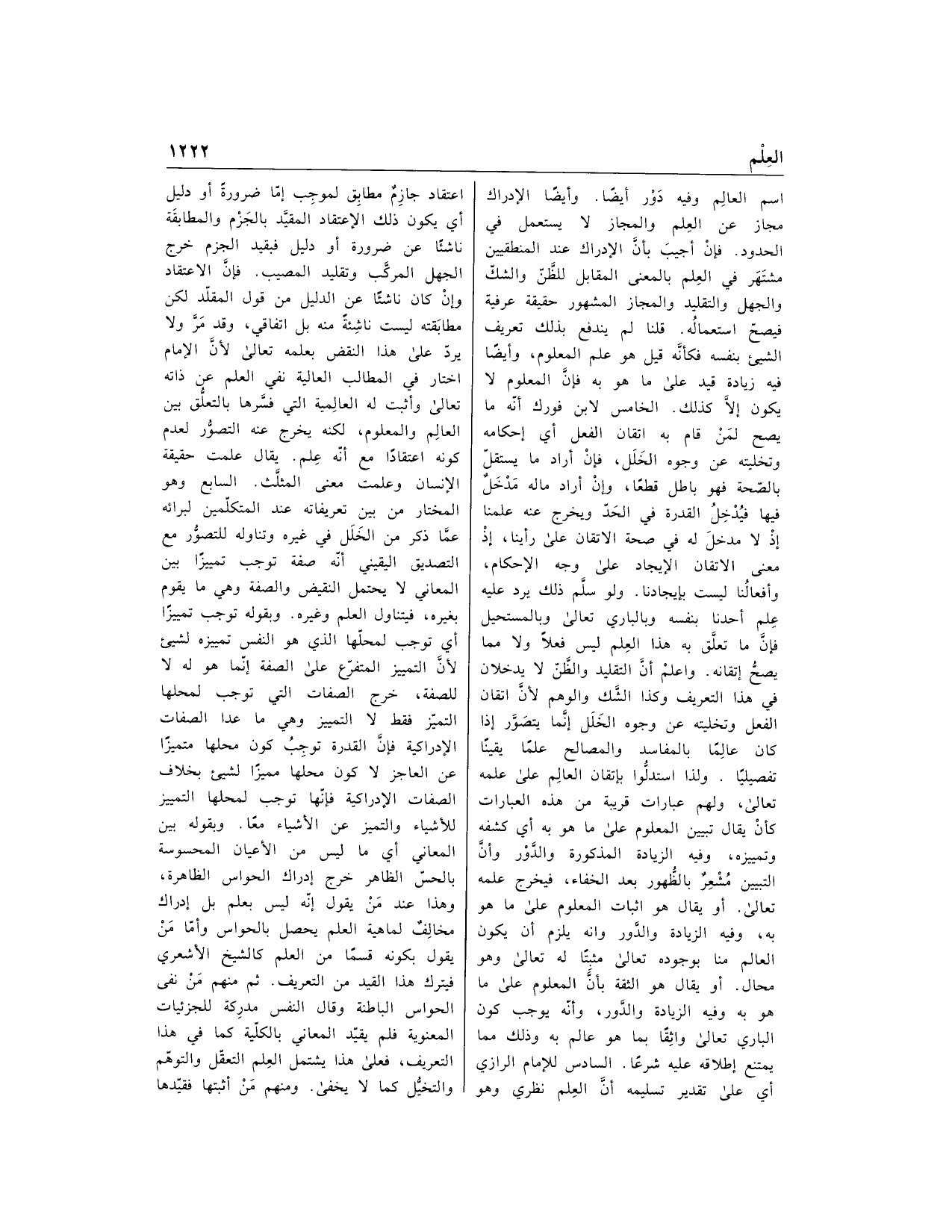 اسم العالم وفيه دور أيضا. وأيضا الإدراك مجاز عن العلم والمجاز لا يستعمل في الحدود. فإن أجيب بأنّ الإدراك عند المنطقيين مشتهر في العلم بالمعنى المقابل للظّنّ والشكّ والجهل والتقليد والمجاز المشهور حقيقة عرفية فيصحّ استعماله. قلنا لم يندفع بذلك تعريف الشيء بنفسه فكأنّه قيل هو علم المعلوم، وأيضا فيه زيادة قيد على ما هو به فإنّ المعلوم لا يكون إلّا كذلك. الخامس لابن فورك أنّه ما يصح لمن قام به اتقان الفعل أي إحكامه وتخليته عن وجوه الخلل، فإن أراد ما يستقلّ بالصّحة فهو باطل قطعا، وإن أراد ماله مدخل فيها فيدخل القدرة في الحدّ ويخرج عنه علمنا إذ لا مدخل له في صحة الاتقان على رأينا، إذ معنى الاتقان الإيجاد على وجه الإحكام، وأفعالنا ليست بإيجادنا. ولو سلّم ذلك يرد عليه علم أحدنا بنفسه وبالباري تعالى وبالمستحيل فإنّ ما تعلّق به هذا العلم ليس فعلا ولا مما يصحّ إتقانه. واعلم أنّ التقليد والظّنّ لا يدخلان في هذا التعريف وكذا الشّك والوهم لأنّ اتقان الفعل وتخليته عن وجوه الخلل إنّما يتصوّر إذا كان عالما بالمفاسد والمصالح علما يقينا تفصيليا. ولذا استدلّوا بإتقان العالم على علمه تعالى، ولهم عبارات قريبة من هذه العبارات كأن يقال تبيين المعلوم على ما هو به أي كشفه وتمييزه، وفيه الزيادة المذكورة والدّور وأنّ التبيين مشعر بالظّهور بعد الخفاء، فيخرج علمه تعالى. أو يقال هو اثبات المعلوم على ما هو به، وفيه الزيادة والدّور وانه يلزم أن يكون العالم منا بوجوده تعالى مثبتا له تعالى وهو محال. أو يقال هو الثقة بأنّ المعلوم على ما هو به وفيه الزيادة والدّور، وأنّه يوجب كون الباري تعالى واثقا بما هو عالم به وذلك مما يمتنع إطلاقه عليه شرعا. السادس للإمام الرازي أي على تقدير تسليمه أنّ العلم نظري وهو اعتقاد جازم مطابق لموجب إمّا ضرورة أو دليل أي يكون ذلك الاعتقاد المقيّد بالجزم والمطابقة ناشئا عن ضرورة أو دليل فبقيد الجزم خرج الجهل المركّب وتقليد المصيب. فإنّ الاعتقاد وإن كان ناشئا عن الدليل من قول المقلّد لكن مطابقته ليست ناشئة منه بل اتفاقي، وقد مرّ ولا يردّ على هذا النقض بعلمه تعالى لأنّ الإمام اختار في المطالب العالية نفي العلم عن ذاته تعالى وأثبت له العالمية التي فسّرها بالتعلّق بين العالم والمعلوم، لكنه يخرج عنه التصوّر لعدم كونه اعتقادا مع أنّه علم. يقال علمت حقيقة الإنسان وعلمت معنى المثلّث. السابع وهو المختار من بين تعريفاته عند المتكلّمين لبرائه عمّا ذكر من الخلل في غيره وتناوله للتصوّر مع التصديق اليقيني أنّه صفة توجب تمييزات بين المعاني لا يحتمل النقيض والصفة وهي ما يقوم بغيره، فيتناول العلم وغيره. وبقوله توجب تمييزا أي توجب لمحلّها الذي هو النفس تمييزه لشيء لأنّ التمييز المتفرّع على الصفة إنّما هو له لا للصفة، خرج الصفات التي توجب لمحلها التميّز فقط لا التمييز وهي ما عدا الصفات الإدراكية فإنّ القدرة توجب كون محلها متميزا عن العاجز لا كون محلها مميزا لشيء بخلاف الصفات الإدراكية فإنّها توجب لمحلها التمييز للأشياء والتميز عن الأشياء معا. وبقوله بين المعاني أي ما ليس من الأعيان المحسوسة بالحسّ الظاهر خرج إدراك الحواس الظاهرة، وهذا عند من يقول إنّه ليس بعلم بل إدراك مخالف لماهية العلم يحصل بالحواس وأمّا من يقول بكونه قسما من العلم كالشيخ الأشعري فيترك هذا القيد من التعريف. ثم منهم من نفى الحواس الباطنة وقال النفس مدركة للجزئيات المعنوية فلم يقيّد المعاني بالكلّية كما في هذا التعريف، فعلى هذا يشتمل العلم التعقّل والتوهّم والتخيّل كما لا يخفى. ومنهم من أثبتها فقيّدها