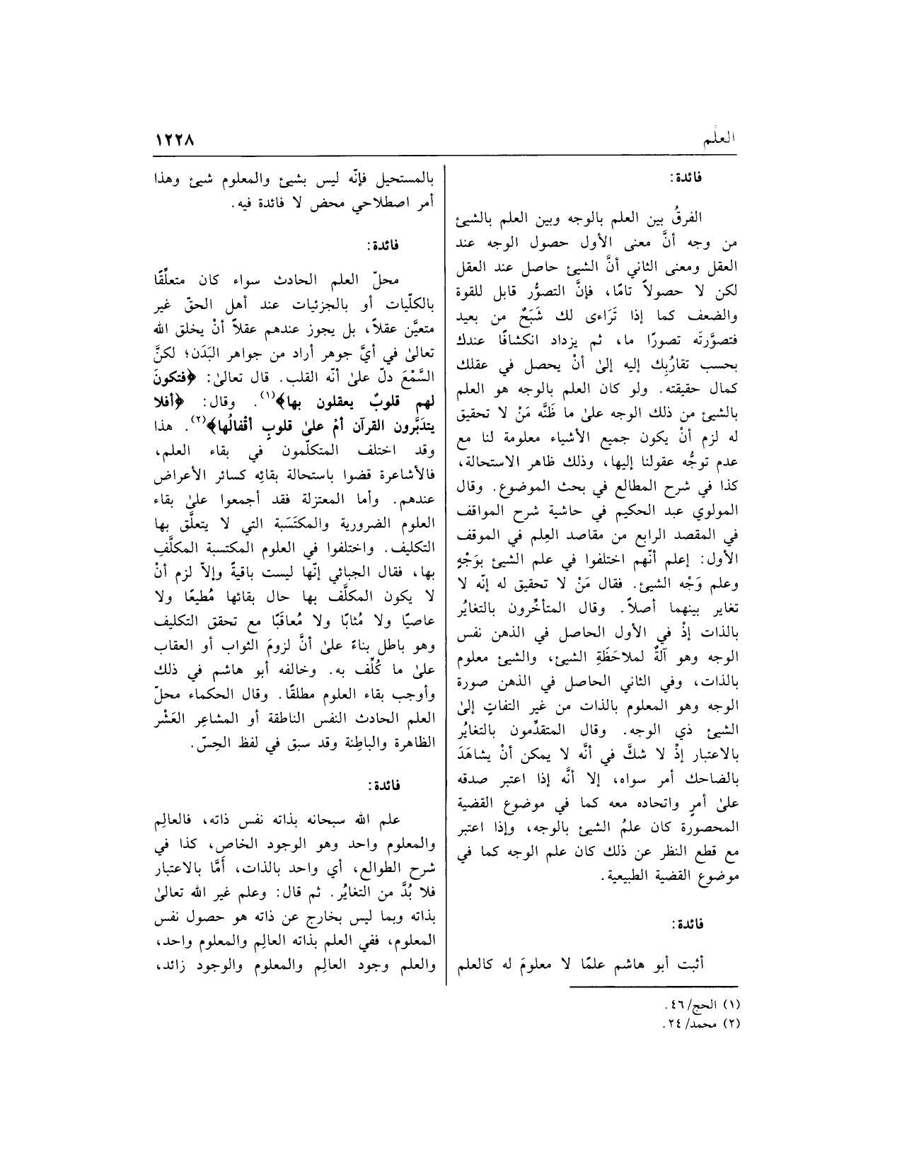 محلّ العلم الحادث سواء كان متعلّقا بالكلّيات أو بالجزئيات عند أهل الحقّ غير متعيّن عقلا، بل يجوز عندهم عقلا أن يخلق الله تعالى في أيّ جوهر أراد من جواهر البدن؛ لكنّ السّمع دلّ على أنّه القلب. قال تعالى: فَتَكُونَ لَهُمْ قُلُوبٌ يَعْقِلُونَ بِها «1». وقال: أَفَلا يَتَدَبَّرُونَ الْقُرْآنَ أَمْ عَلى قُلُوبٍ أَقْفالُها «2». هذا وقد اختلف المتكلّمون في بقاء العلم، فالأشاعرة قضوا باستحالة بقائه كسائر الأعراض عندهم. وأما المعتزلة فقد أجمعوا على بقاء العلوم الضرورية والمكتسبة التي لا يتعلّق بها التكليف. واختلفوا في العلوم المكتسبة المكلّف بها، فقال الجبائي إنّها ليست باقية وإلّا لزم أن لا يكون المكلّف بها حال بقائها مطيعا ولا عاصيا ولا مثابا ولا معاقبا مع تحقق التكليف وهو باطل بناء على أنّ لزوم الثواب أو العقاب على ما كلّف به. وخالفه أبو هاشم في ذلك وأوجب بقاء العلوم مطلقا. وقال الحكماء محلّ العلم الحادث النفس الناطقة أو المشاعر العشر الظاهرة والباطنة وقد سبق في لفظ الحسّ.