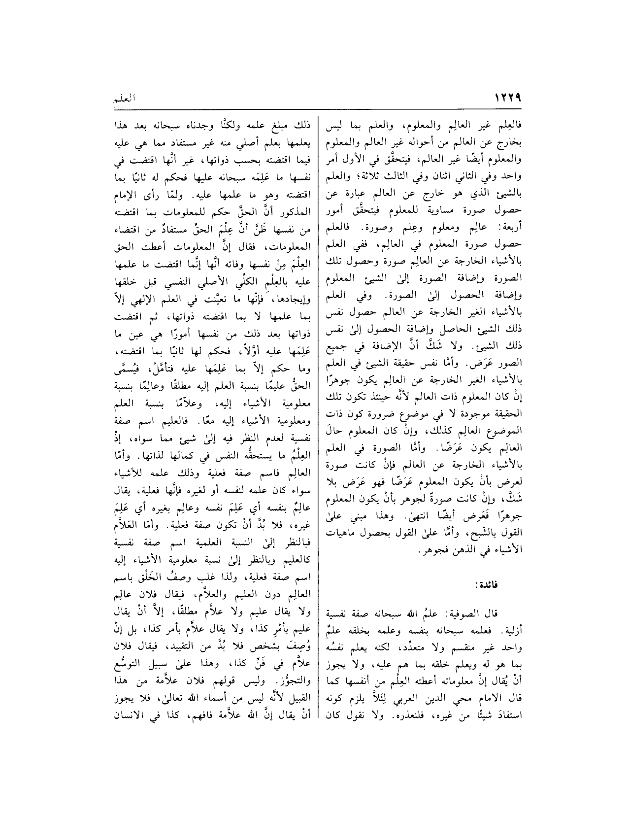 قال الصوفية: علم الله سبحانه صفة نفسية أزلية. فعلمه سبحانه بنفسه وعلمه بخلقه علم واحد غير منقسم ولا متعدّد، لكنه يعلم نفسه بما هو له ويعلم خلقه بما هم عليه، ولا يجوز أن يقال إنّ معلوماته أعطته العلم من أنفسها كما قال الامام محي الدين العربي لئلّا يلزم كونه استفاد شيئا من غيره، فلنعذره. ولا نقول كان ذلك مبلغ علمه ولكنّا وجدناه سبحانه بعد هذا يعلمها بعلم أصلي منه غير مستفاد مما هي عليه فيما اقتضته بحسب ذواتها، غير أنّها اقتضت في نفسها ما علمه سبحانه عليها فحكم له ثانيا بما اقتضته وهو ما علمها عليه. ولمّا رأى الإمام المذكور أنّ الحقّ حكم للمعلومات بما اقتضته من نفسها ظنّ أنّ علم الحقّ مستفاد من اقتضاء المعلومات، فقال إنّ المعلومات أعطت الحق العلم من نفسها وفاته أنّها إنّما اقتضت ما علمها عليه بالعلم الكلّي الأصلي النفسي قبل خلقها وإيجادها، فإنّها ما تعيّنت في العلم الإلهي إلّا بما علمها لا بما اقتضته ذواتها، ثم اقتضت ذواتها بعد ذلك من نفسها أمورا هي عين ما علمها عليه أوّلا، فحكم لها ثانيا بما اقتضته، وما حكم إلّا بما علمها عليه فتأمّل، فيسمّى الحقّ عليما بنسبة العلم إليه مطلقا وعالما بنسبة معلومية الأشياء إليه، وعلّاما بنسبة العلم ومعلومية الأشياء إليه معا. فالعليم اسم صفة نفسية لعدم النظر فيه إلى شيء مما سواه، إذ العلم ما يستحقّه النفس في كمالها لذاتها. وأمّا العالم فاسم صفة فعلية وذلك علمه للأشياء سواء كان علمه لنفسه أو لغيره فإنّها فعلية، يقال عالم بنفسه أي علم نفسه وعالم بغيره أي علم غيره، فلا بدّ أن تكون صفة فعلية. وأمّا العلّام فبالنظر إلى النسبة العلمية اسم صفة نفسية كالعليم وبالنظر إلى نسبة معلومية الأشياء إليه اسم صفة فعلية، ولذا غلب وصف الخلق باسم العالم دون العليم والعلّام، فيقال فلان عالم ولا يقال عليم ولا علّام مطلقا، إلّا أن يقال عليم بأمر كذا، ولا يقال علّام بأمر كذا، بل إن وصف بشخص فلا بدّ من التقييد، فيقال فلان علّام في فنّ كذا، وهذا على سبيل التوسّع والتجوّز. وليس قولهم فلان علّامة من هذا القبيل لأنّه ليس من أسماء الله تعالى، فلا يجوز أن يقال إنّ الله علّامة فافهم، كذا في الانسان