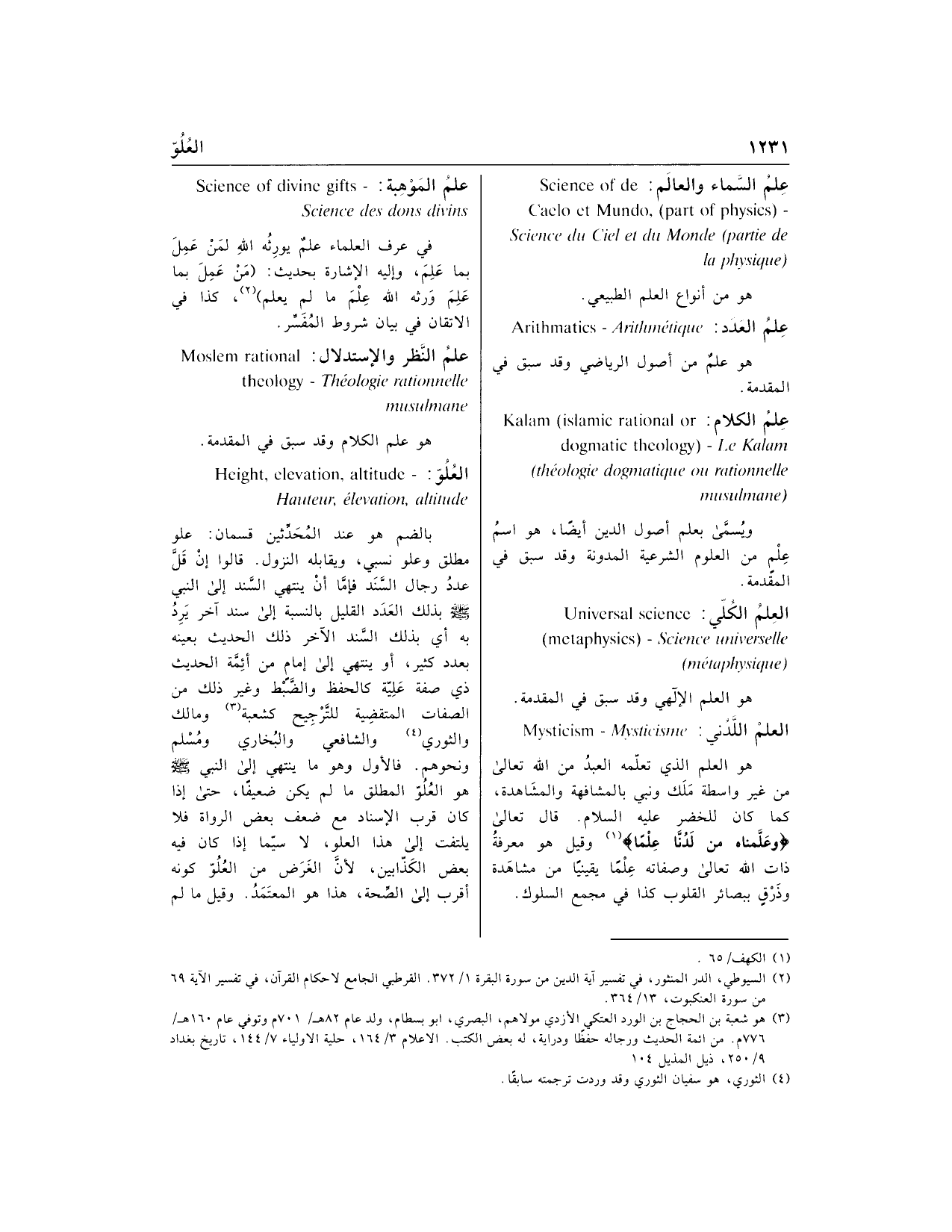 [ في الفرنسية] Science des dons divins في عرف العلماء علم يورثه الله لمن عمل بما علم، وإليه الإشارة بحديث: (من عمل بما علم ورثه الله علم ما لم يعلم) «2»، كذا في الاتقان في بيان شروط المفسّر.