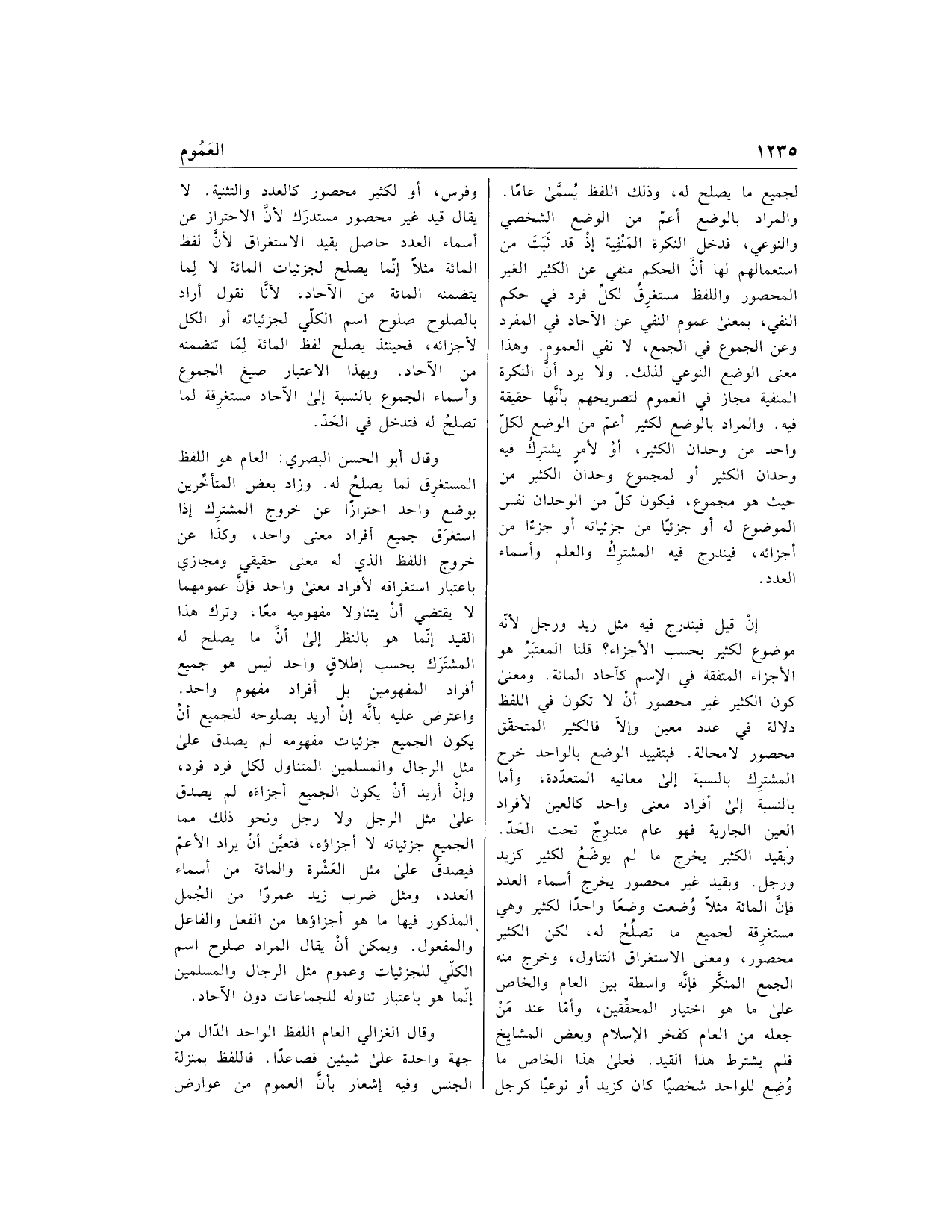 إن قيل فيندرج فيه مثل زيد ورجل لأنّه موضوع لكثير بحسب الأجزاء؟ قلنا المعتبر هو الأجزاء المتفقة في الاسم كآحاد المائة. ومعنى كون الكثير غير محصور أن لا تكون في اللفظ دلالة في عدد معين وإلّا فالكثير المتحقّق محصور لا محالة. فبتقييد الوضع بالواحد خرج المشترك بالنسبة إلى معانيه المتعدّدة، وأمّا بالنسبة إلى أفراد معنى واحد كالعين لأفراد العين الجارية فهو عام مندرج تحت الحدّ.