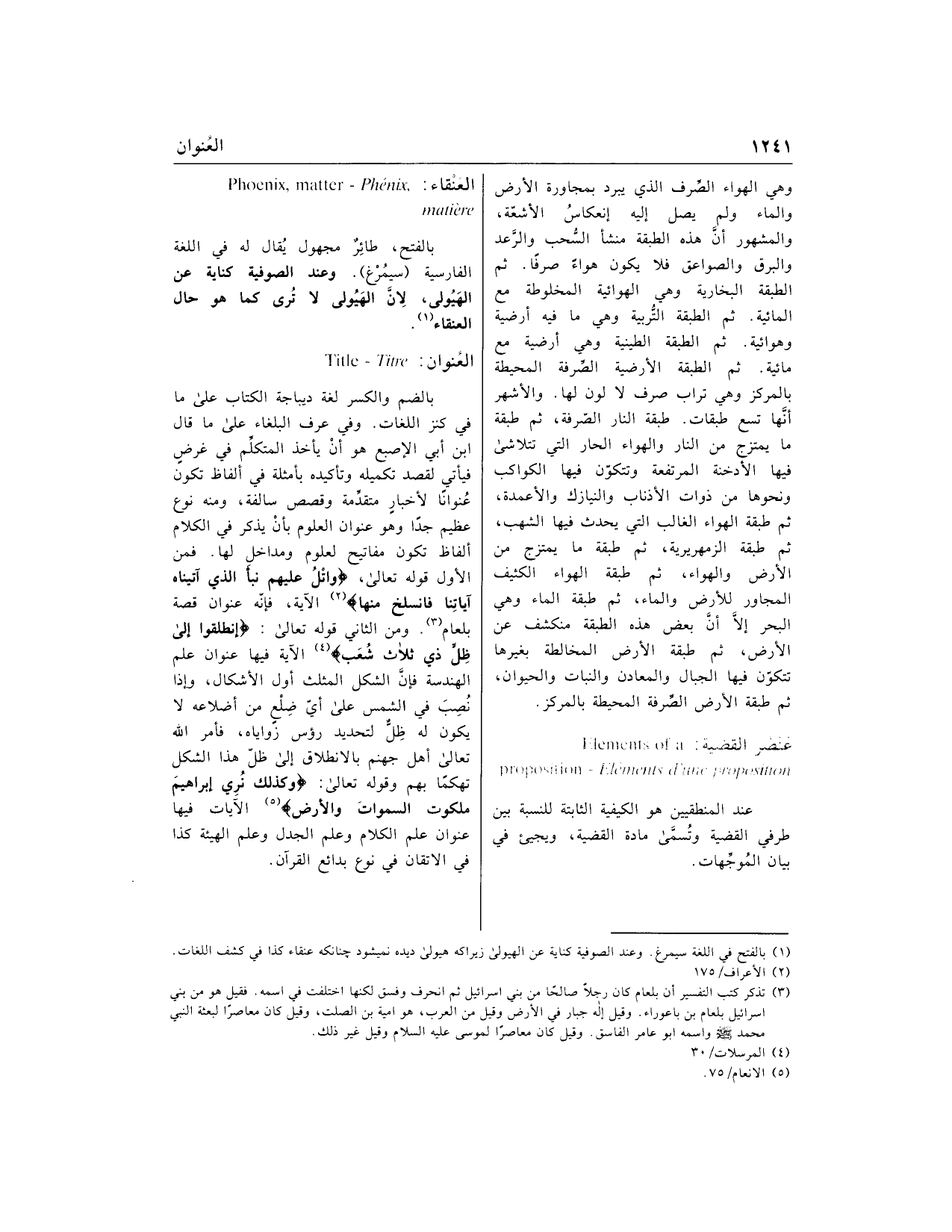 (1) بالفتح في اللغة سيمرغ. وعند الصوفية كناية عن الهيولى زيرا كه هيولى ديده نمى شود چنانكه عنقاء كذا في كشف اللغات.
